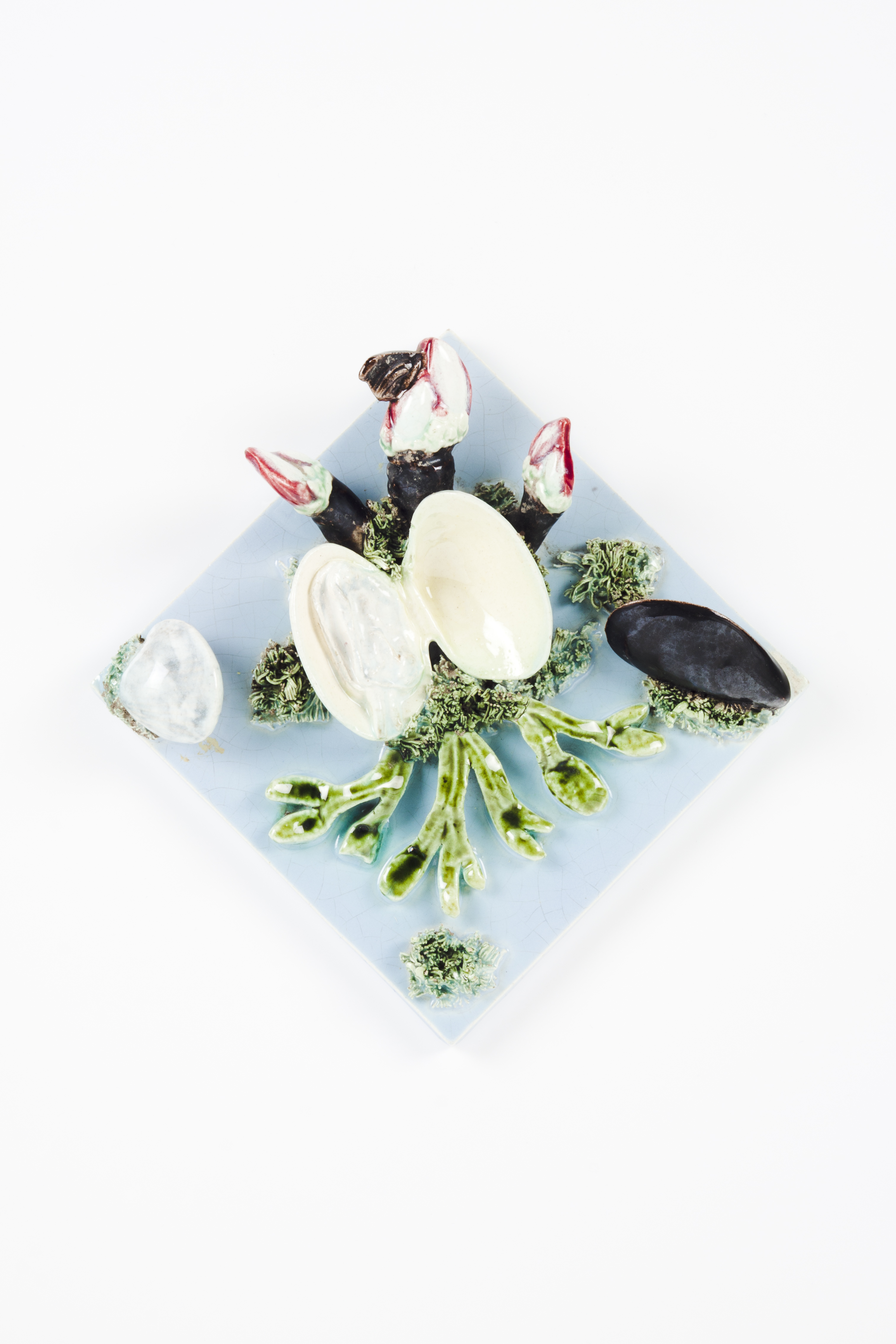 Em barro moldado, vidrado e policromado representando percebe, mexilhão, berbigão, amêijoas e algas