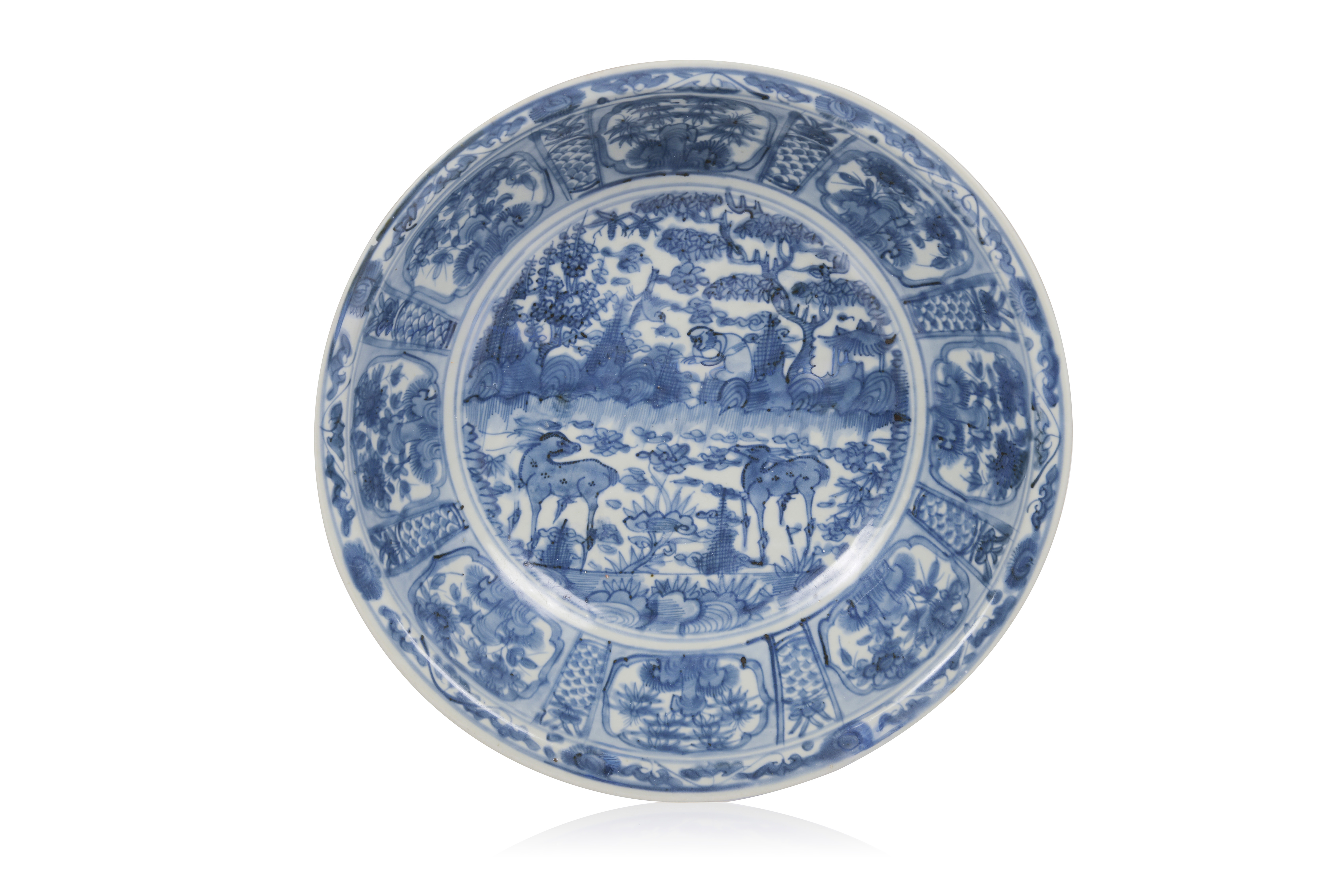 Decorada a azul sob vidrado, representando ao centro uma paisagem com corços, macaco e pássaro