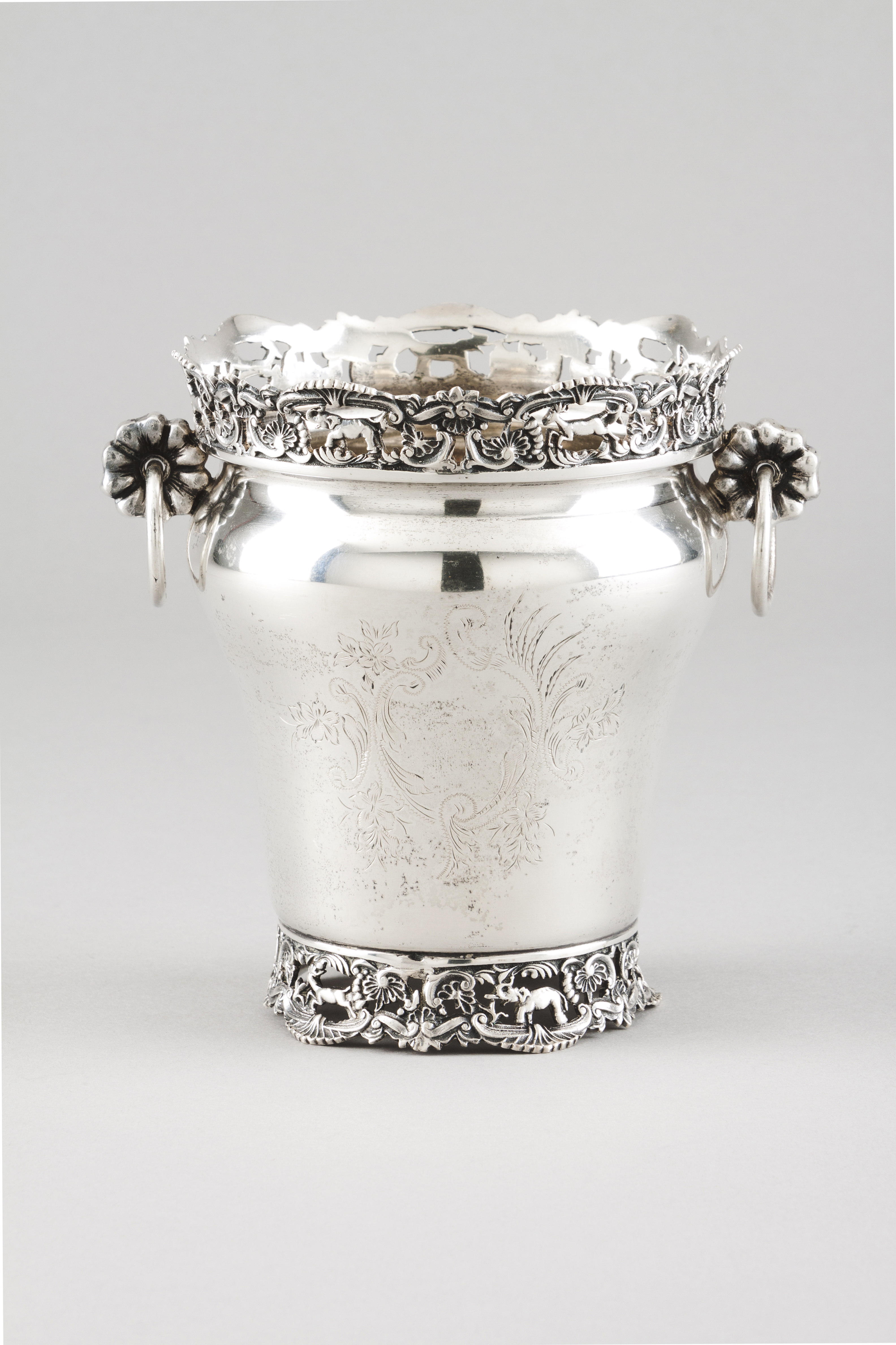 Corpo em cino invertido cinzelado com reservas de motivos vegetalistas, pé e bordo com cercadura vazada com representação de elefantes e veados no meio de vegetação