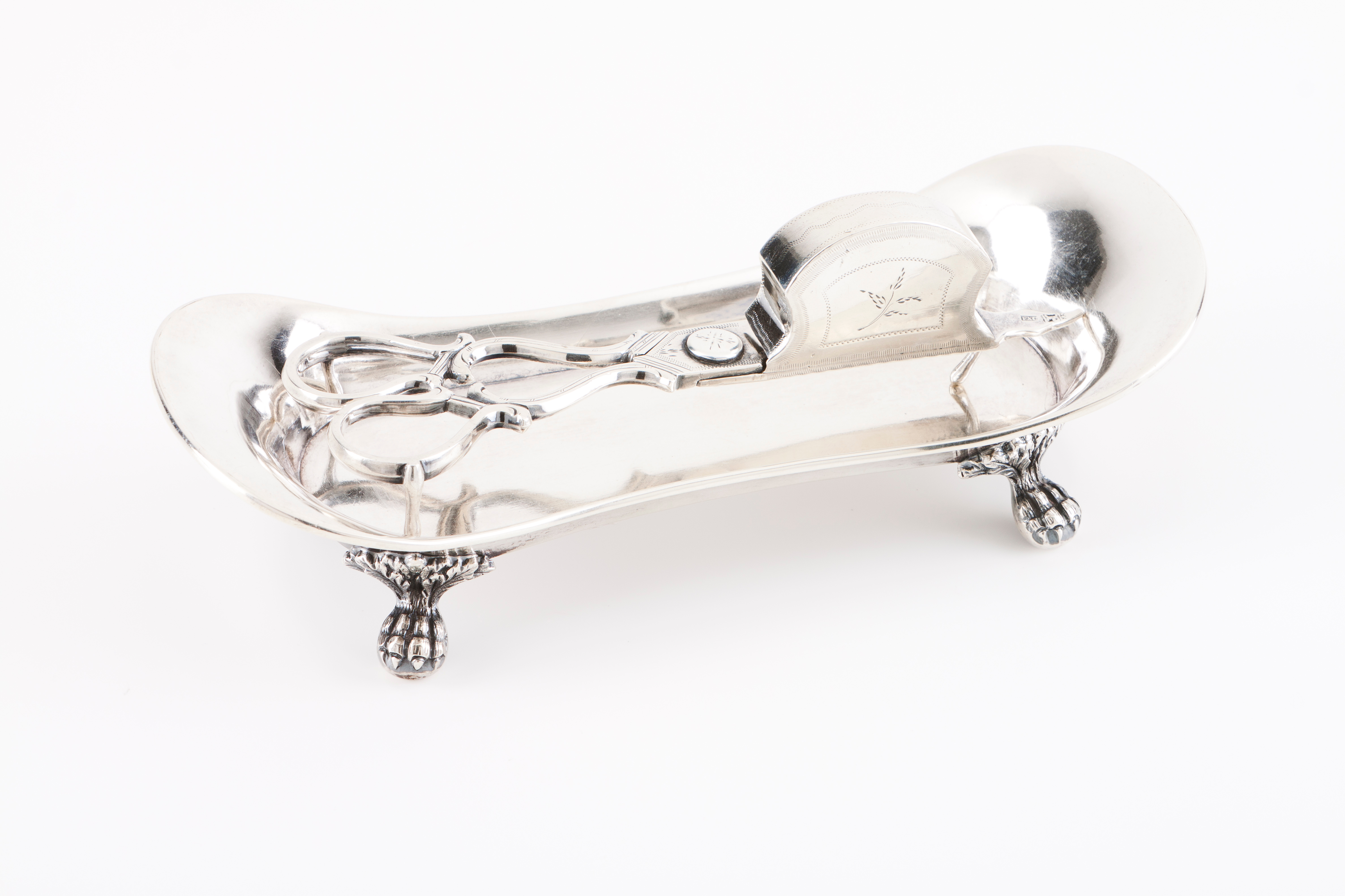 Bandeja lisa assente sobre quatro pés de garra, tesoura recortada com braços de voluta