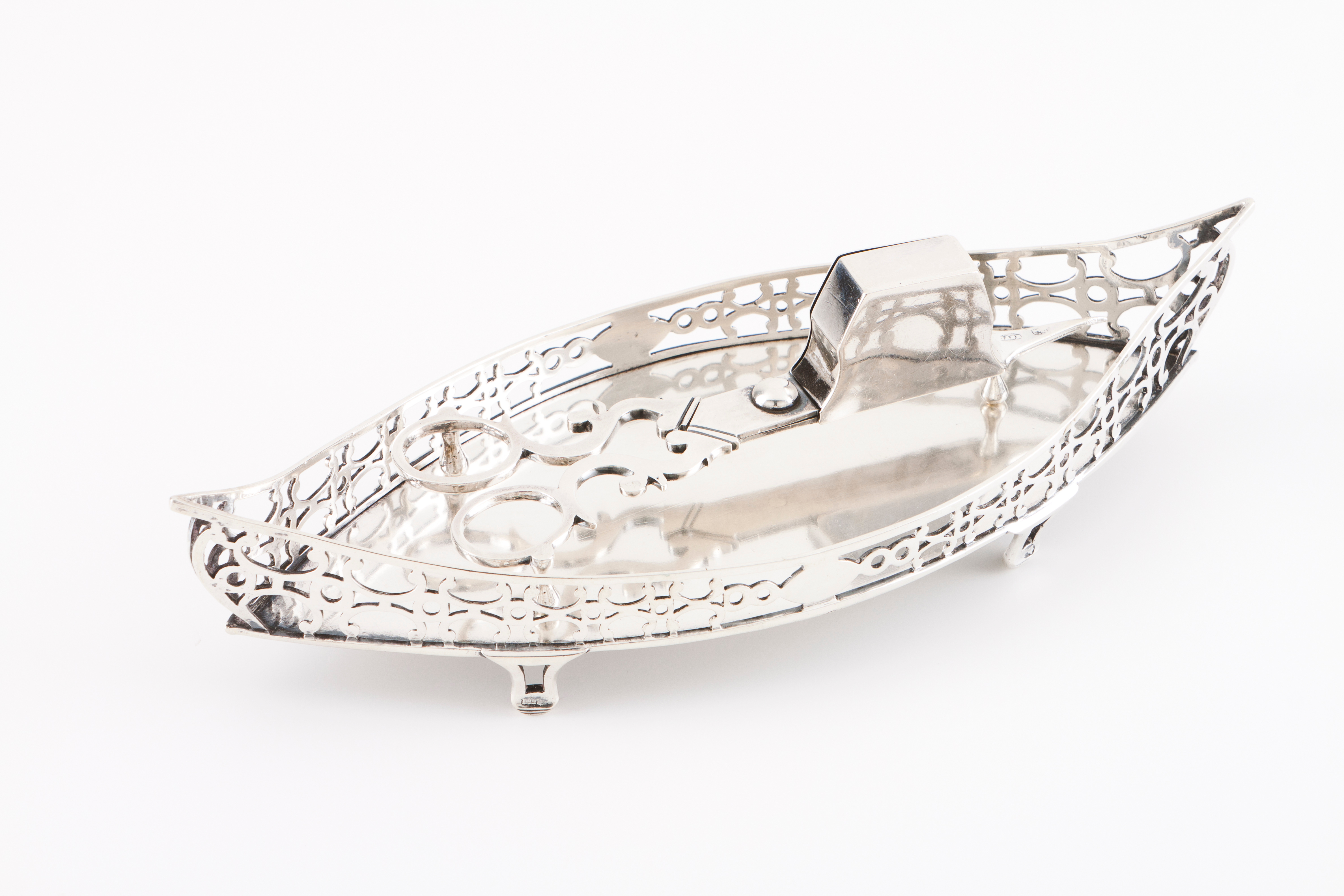 Bandeja em forma de naveta com gradinha e quatro pés vazados