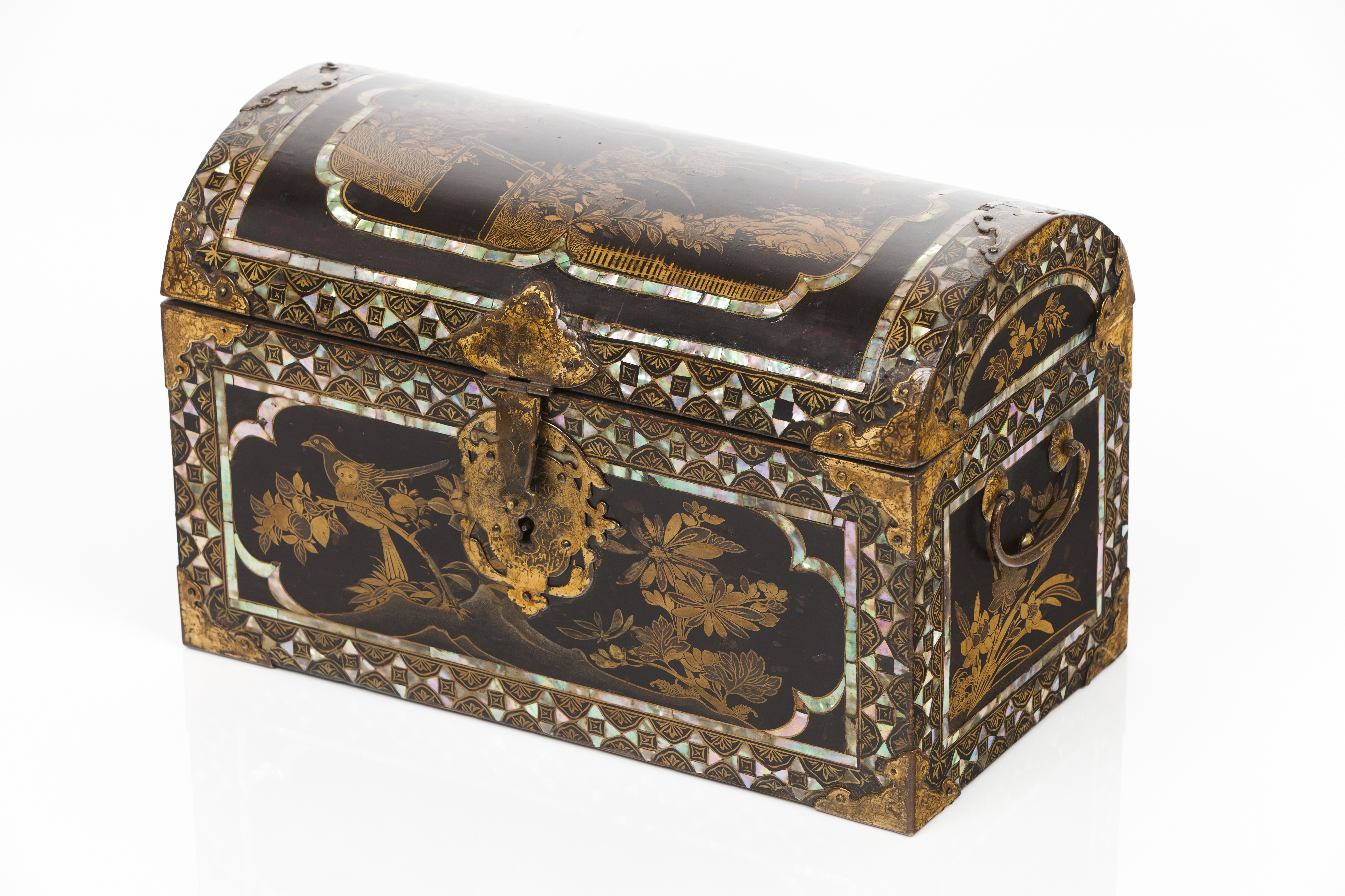 Com decoração a ouro e embutidos em madrepérola