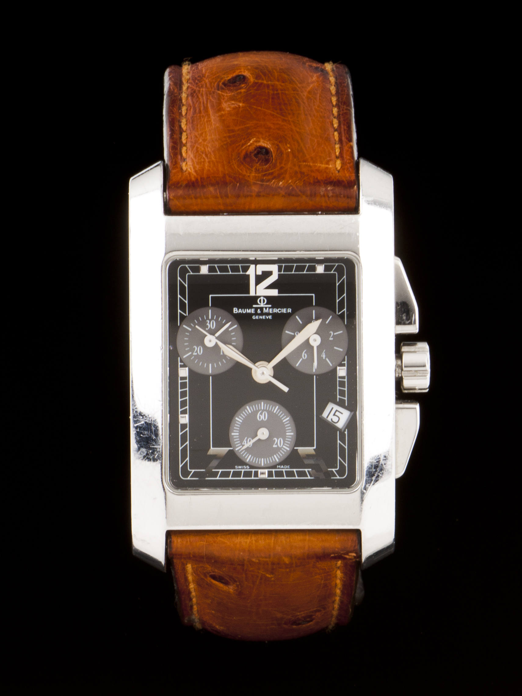 Relógio Baume & Mercier, de homem, modelo Hampton, referência 65341, com caixa em aço de 28mm x 42mm. Movimento de quartzo com cronógrafo e data às 4 horas. Relógio com bracelete em pele e báscula da marca. Com sinais de uso. A funcionar ao momento da avaliação.