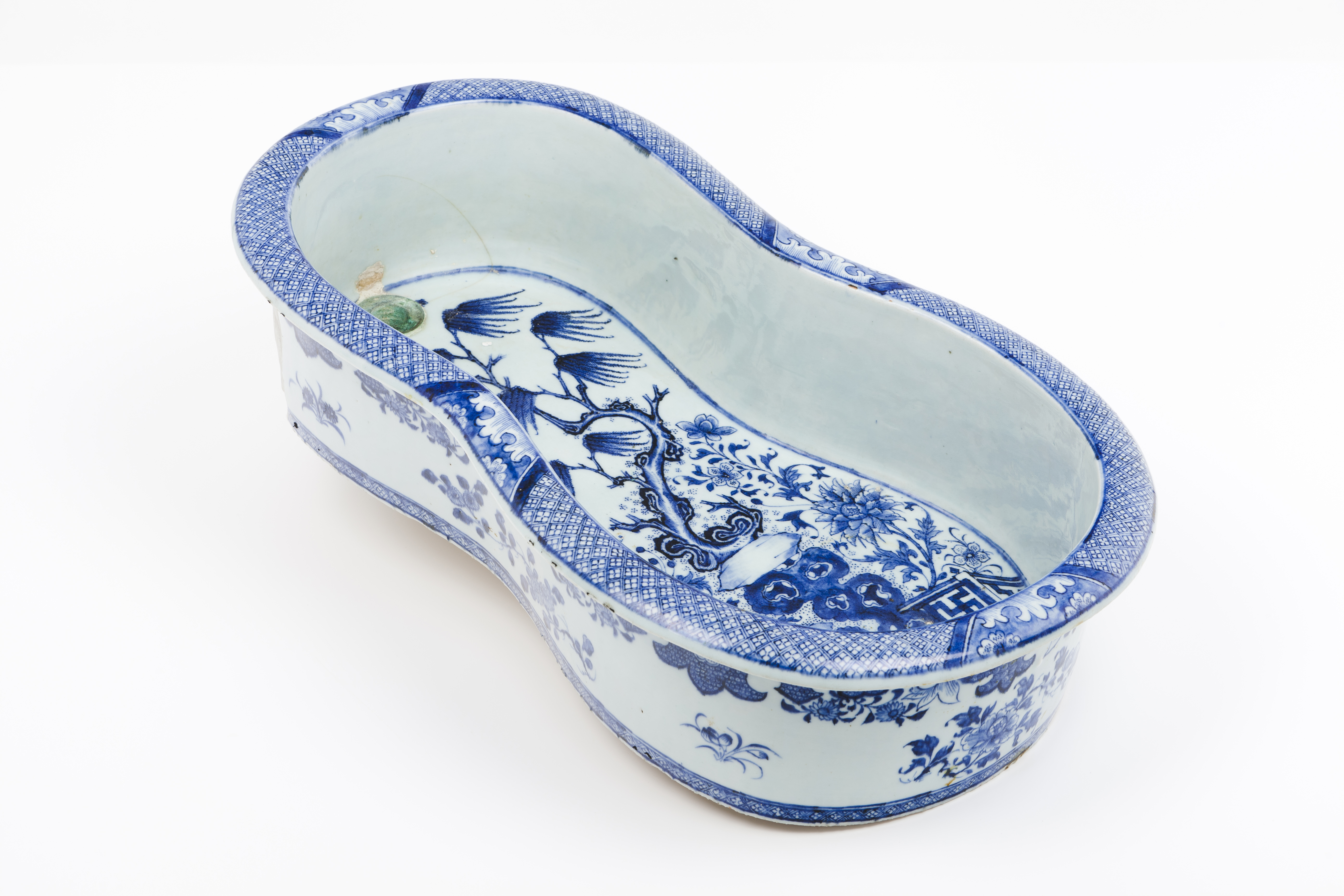 Com decoração a azul representando no interior vista de jardim com salgueiro, rochedo, vedação e flores