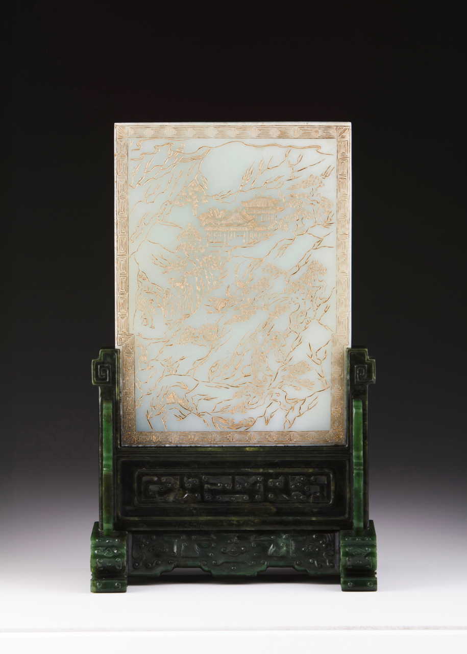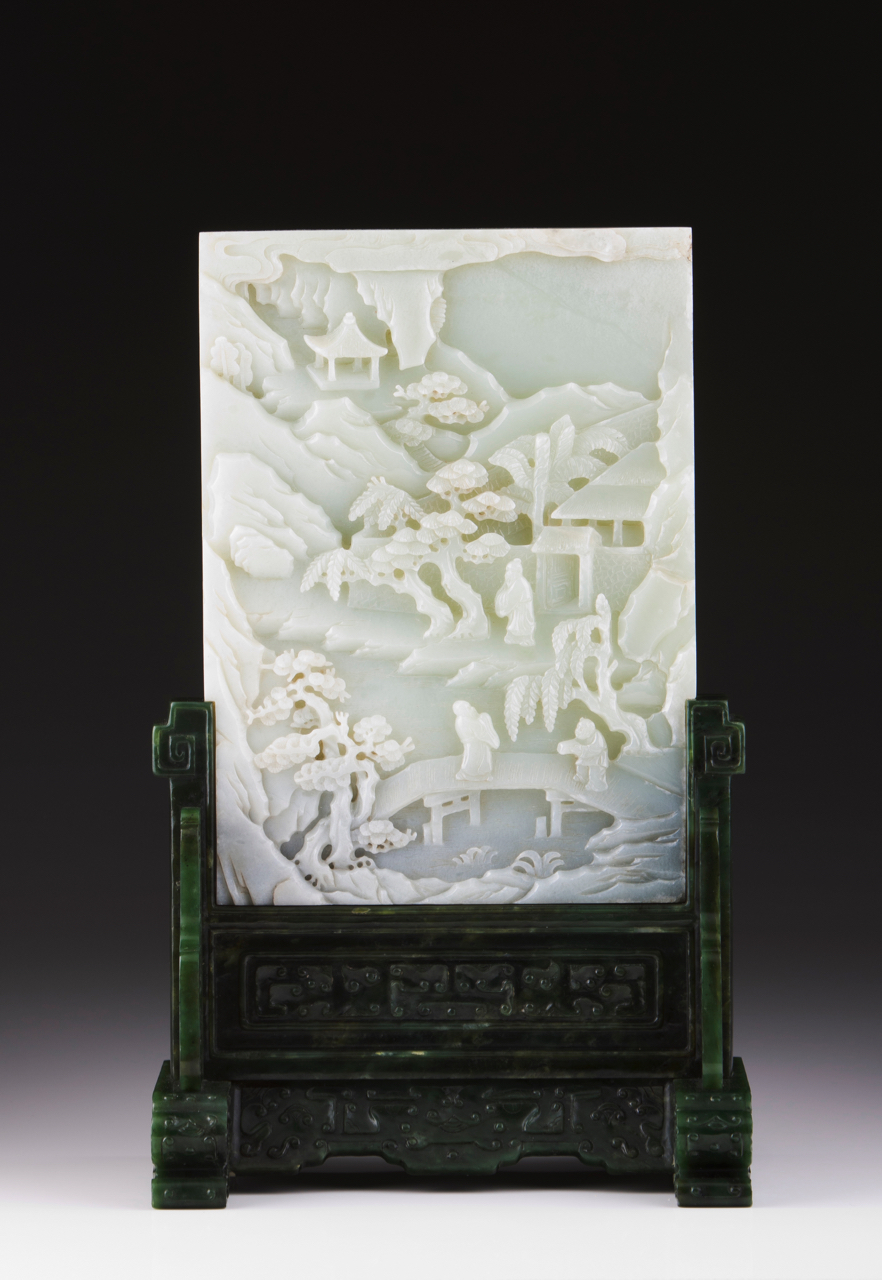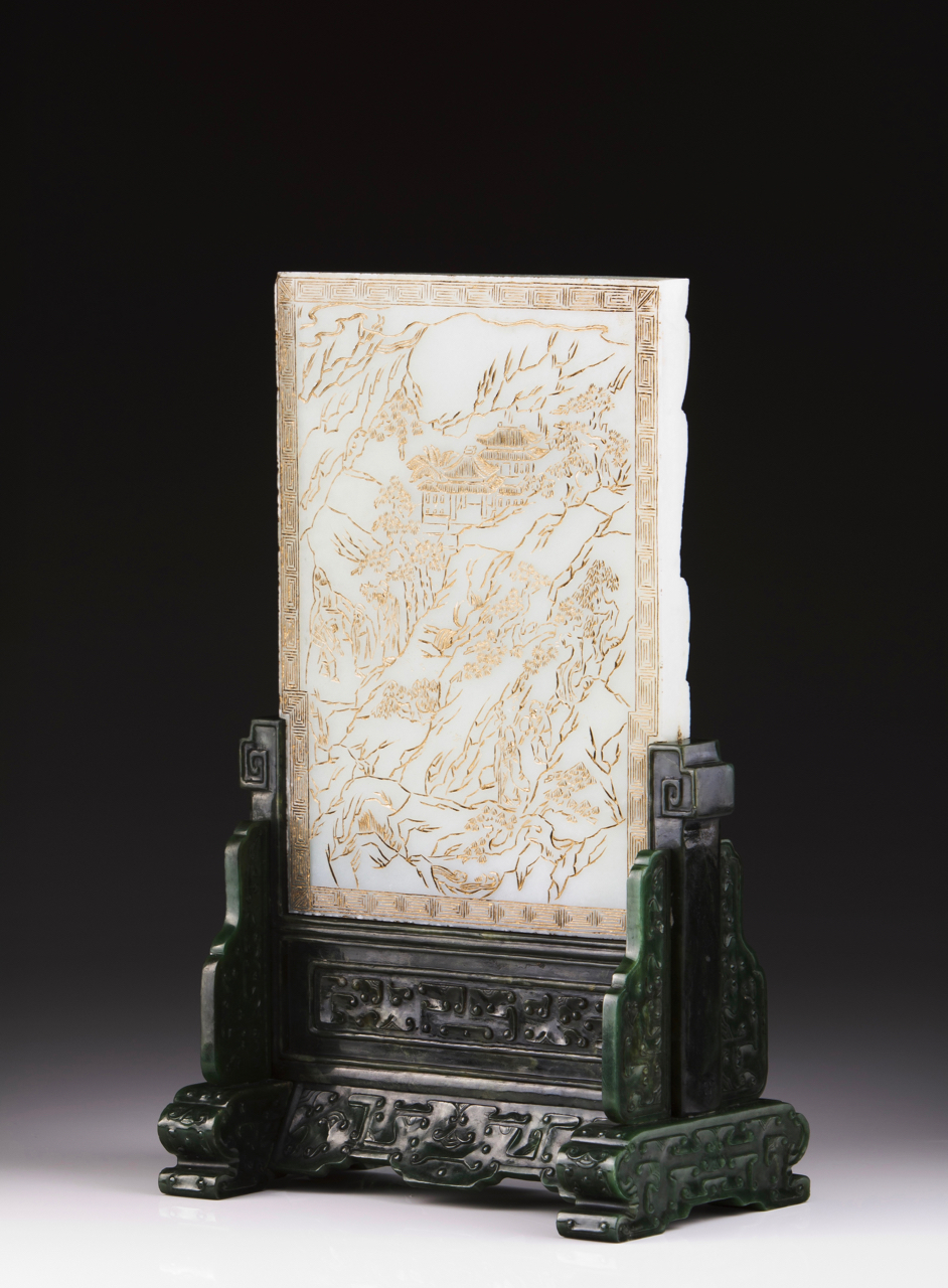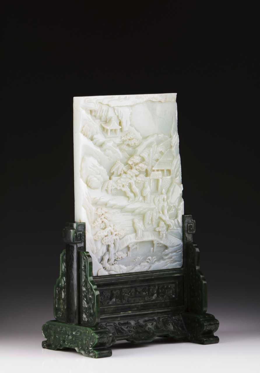 Placa finamente esculpida em baixo relevo, num dos lados, representando paisagem montanhosa com figuras e pagodes
