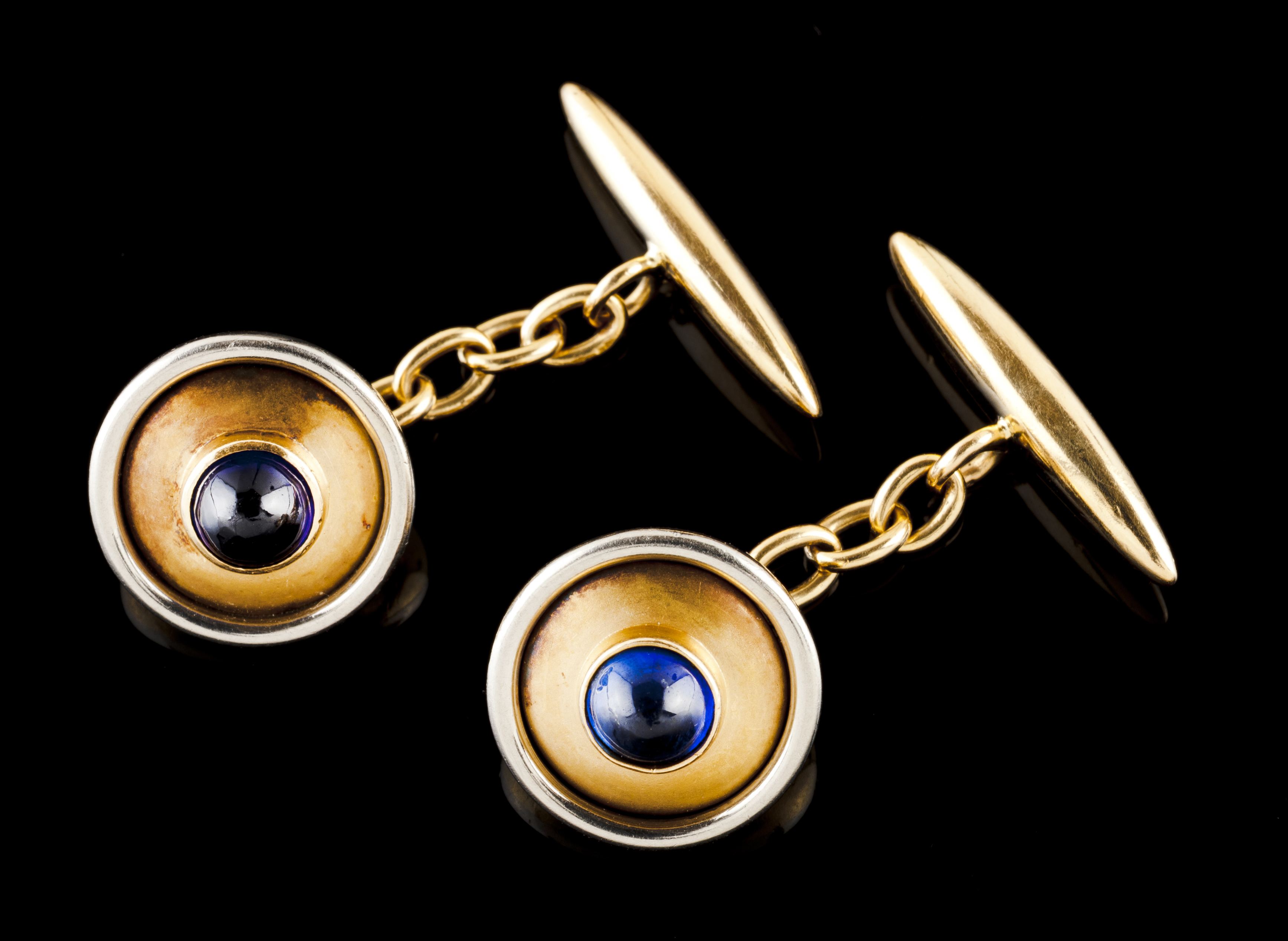 Formato circular cravejados com duas safiras em talhe cabuchão