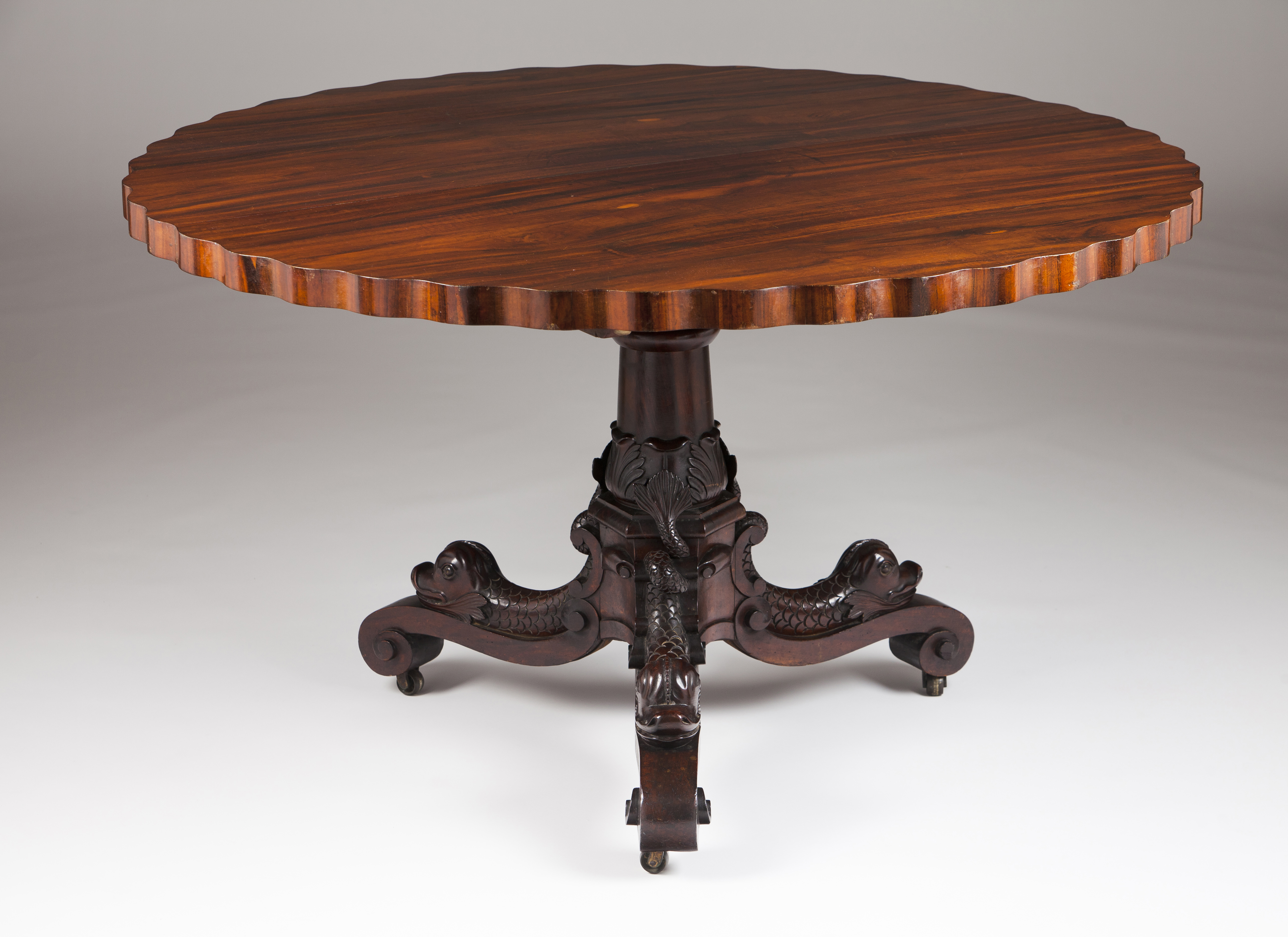 Coluna central e três pés em forma de golfinhos com rodízios