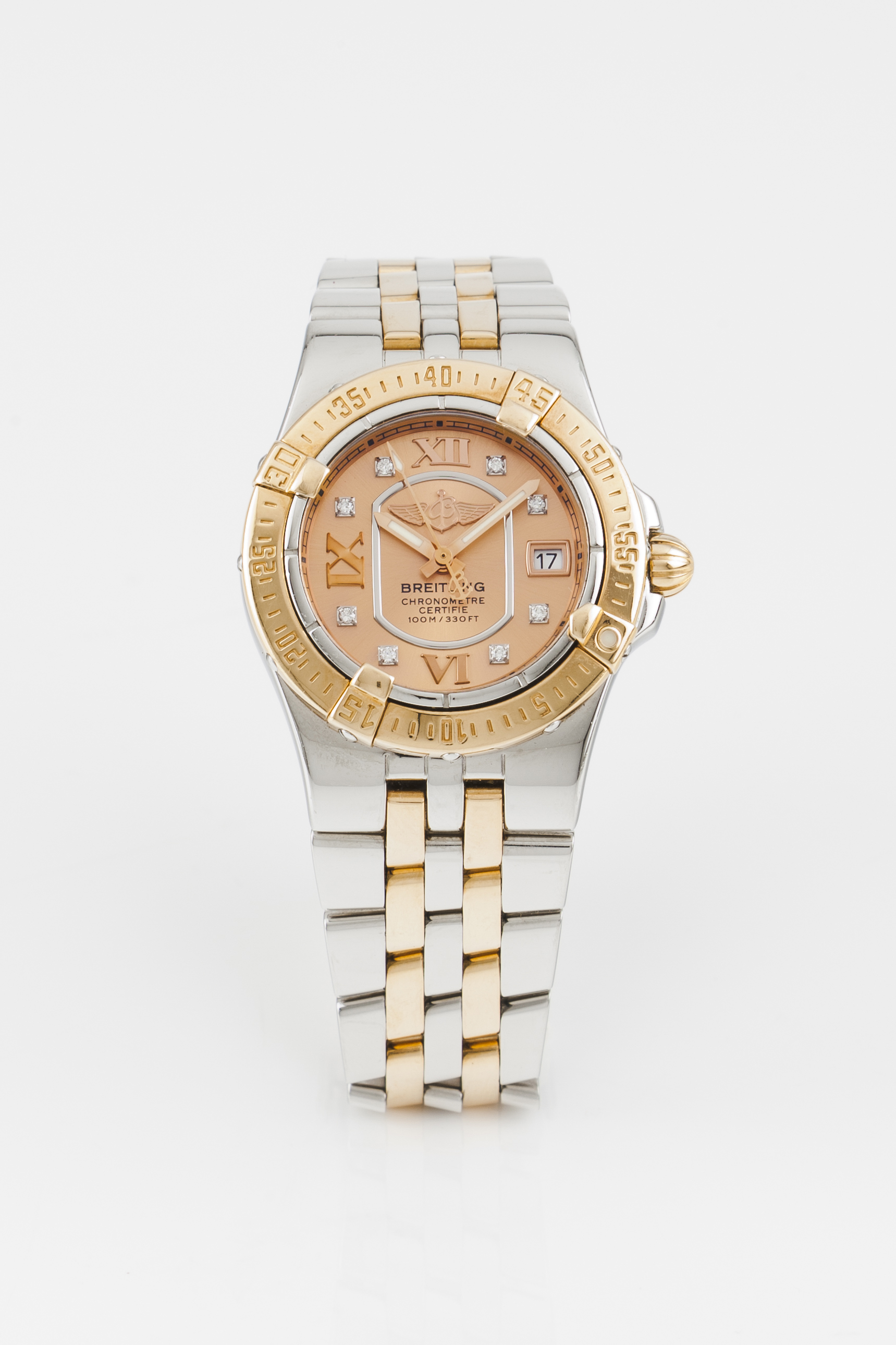 Relógio marca Breitling de senhora modelo Galatic. Movimento de quartzo chronometer com data às 3h e mostrador em madre-pérola com 8 indexes em brilhante. Caixa e bracelete em aço e ouro. Bom estado de conservação.