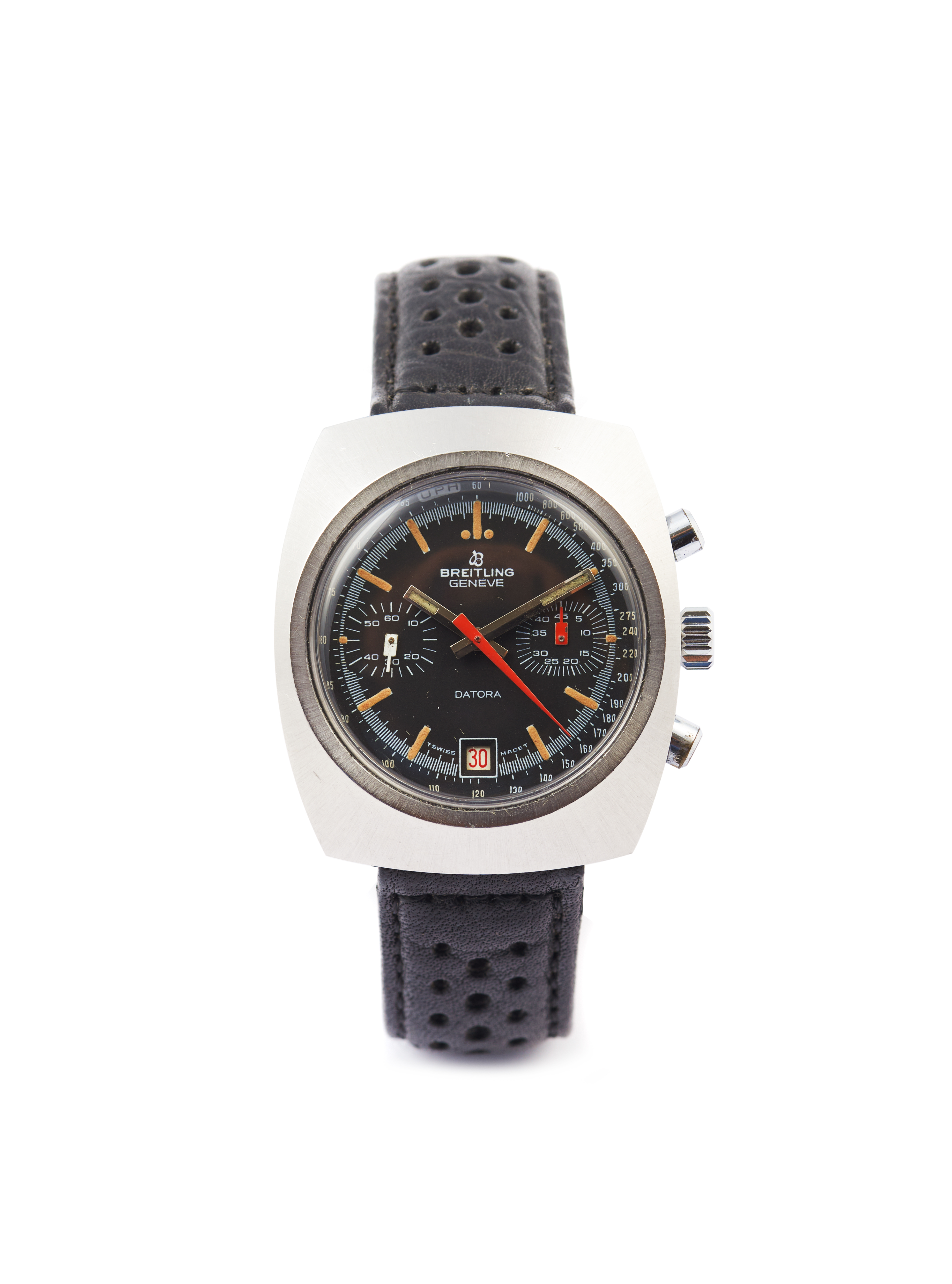 Modelo Datora . Movimento mecânico de corda manual (cal. Valjoux 7734) com função cronógrafo e data às 18h. Caixa em aço. Em muito bom estado de conservação.