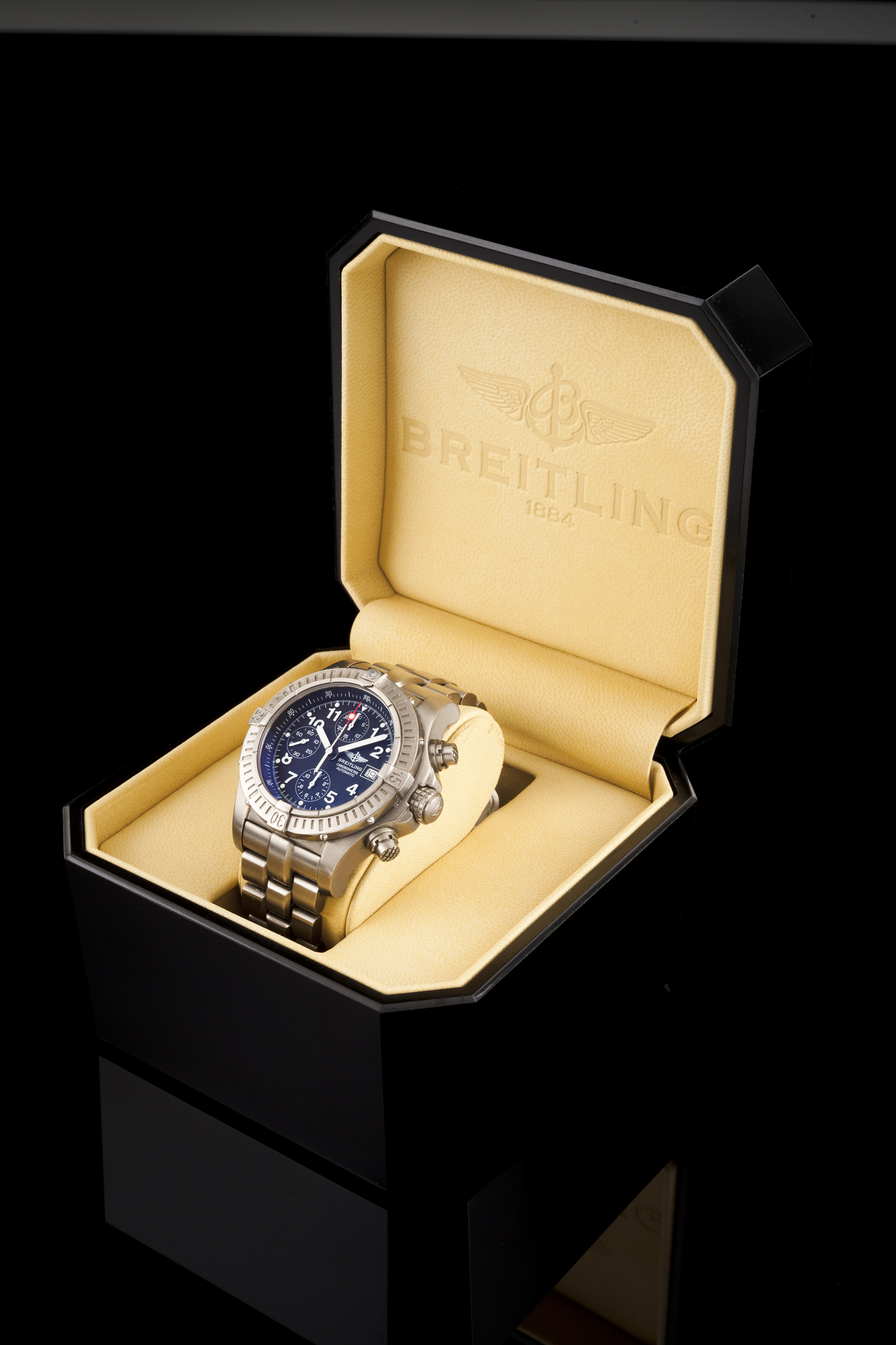 Relógio Breitling, modelo Avenger, referência E13360, com caixa e bracelete em titânio. Caixa com 44mm de diâmetro. Movimento mecânico chronometre automático com função de cronógrafo e data. Relógio em excelente estado, quase sem marcas de uso. Acompanha caixas, documentos e 3 elos da bracelete.