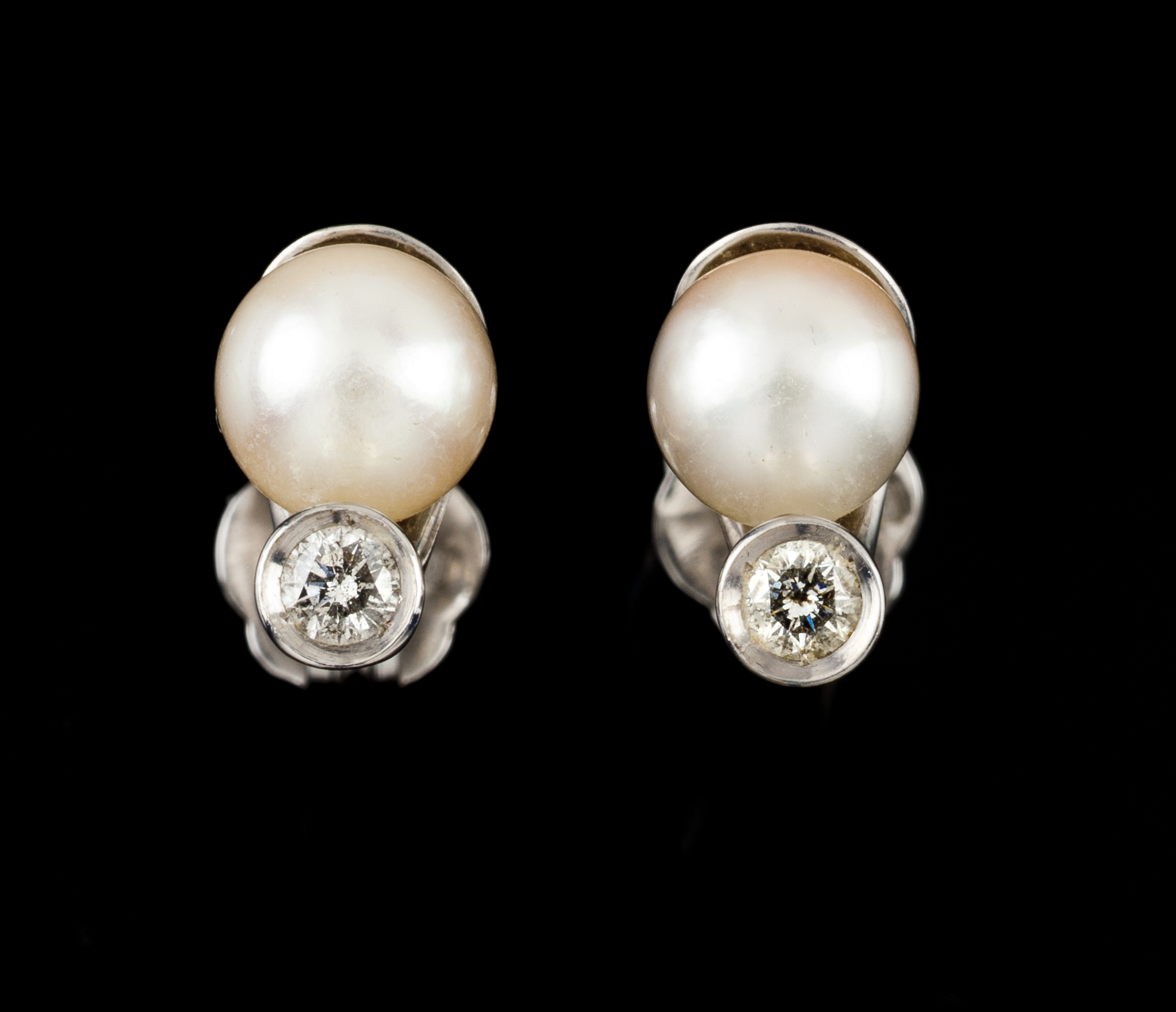 Cravejados com duas pérolas de cultura (ca. 6 mm) e dois diamantes em talhe de brilhante com total (ca. 0.15ct)