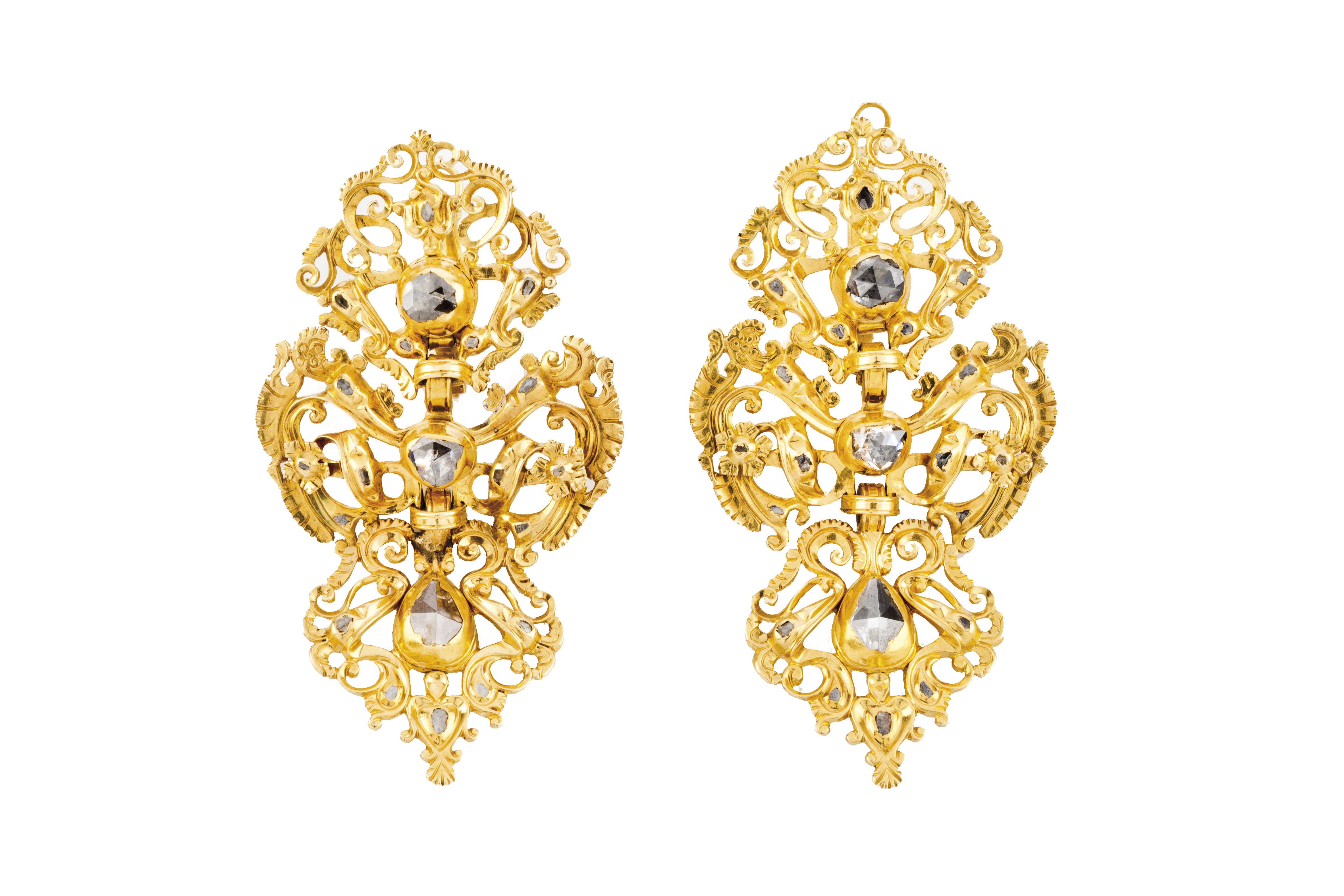 Trabalho recortado e cinzelado de inspiração vegetalista de acantos, enrolamentos e volutas, cravejados com 6 diamantes em talhe de rosa coroada e diversos mais pequenos em talhe rosa