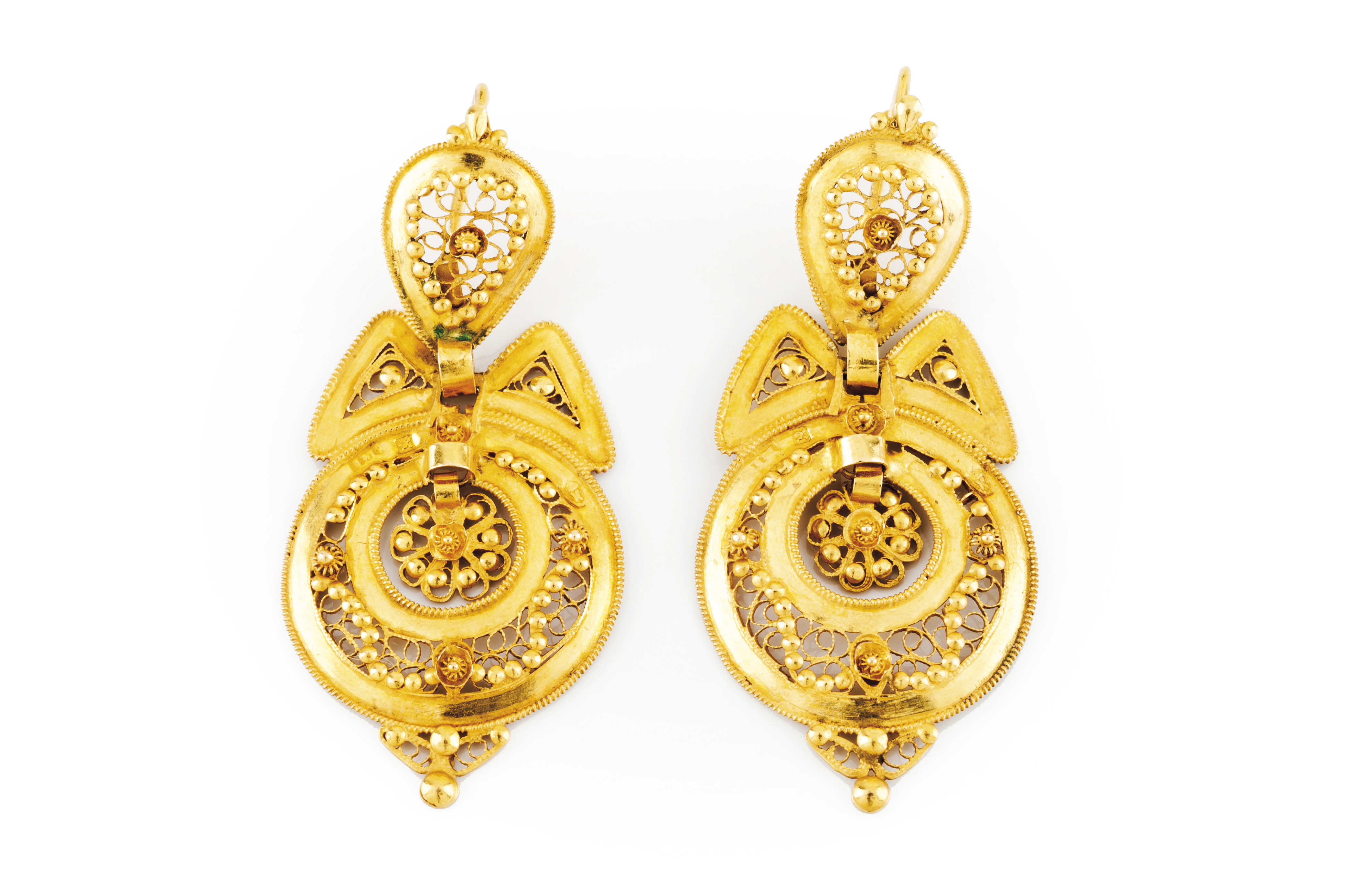 Trabalho em filigrana com enrolamentos e granitos composto por elementos articulados, em círculo, laço e coração