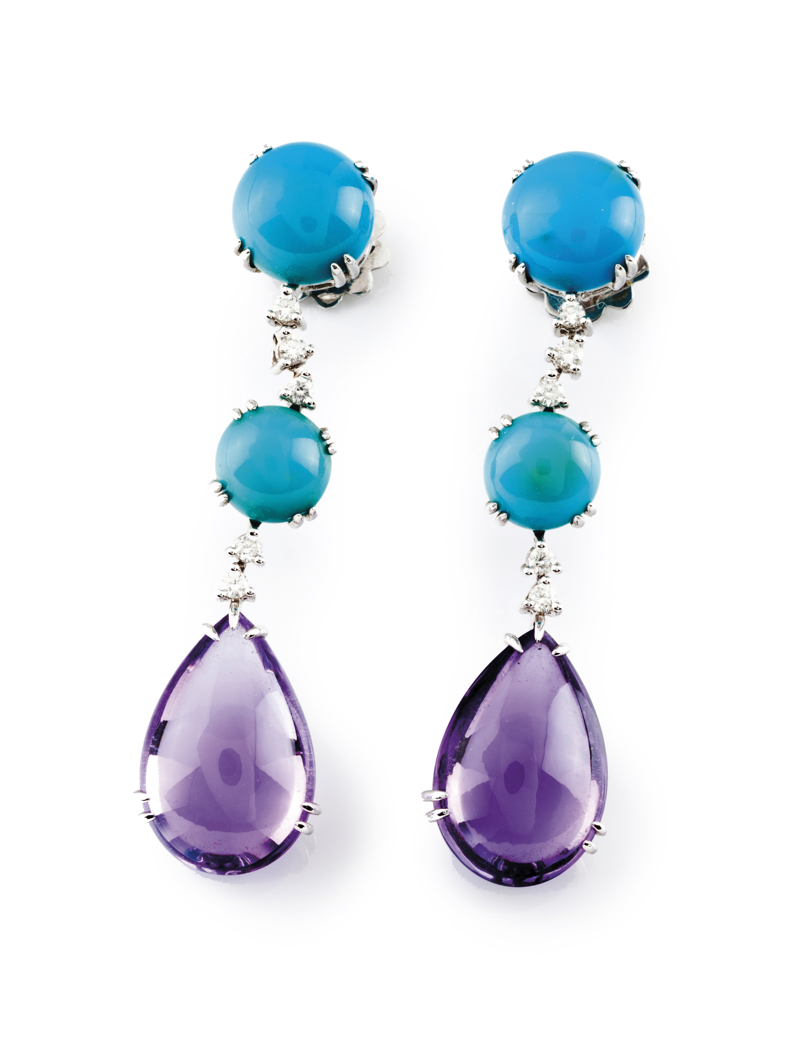 Cravejados com 4 turquesas redondas em talhe de cabuchão, duas ametistas periformes em talhe de cabuchão e 10 pequenos diamantes em talhe de brilhante