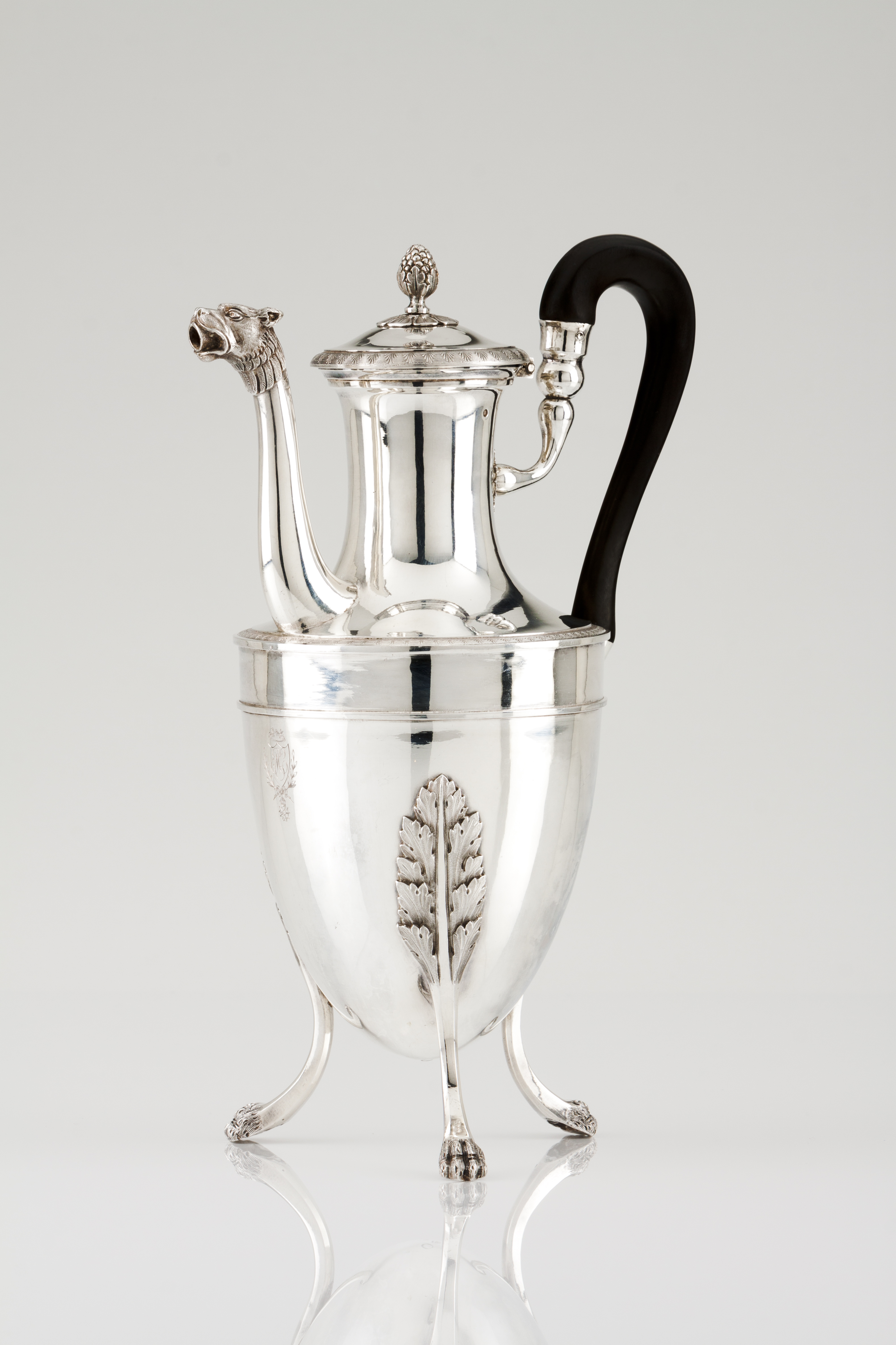 De formato ovoide assente em três pés de cabeça de pantera com remates de folhagem. Bico de cabeça de pantera com pomo de fruto. Monograma gravado em cartela encimada por coroa de flores e Legion-d'Honneur coroada e emoldurada por louros.