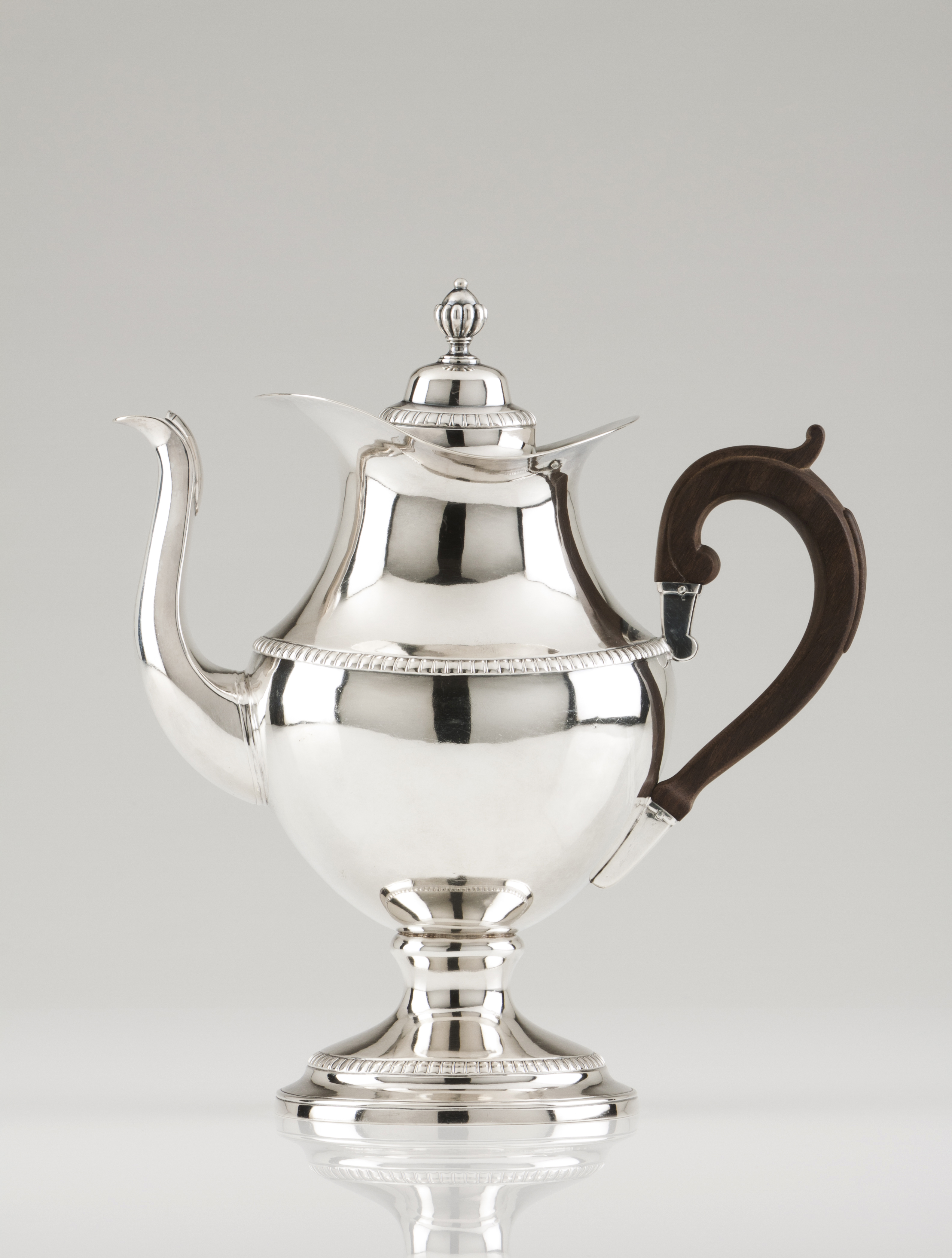 Bojo liso com frisos de godrões, boca ondulada e tampa em cúpula com pomo canelado trabalhando em charneira