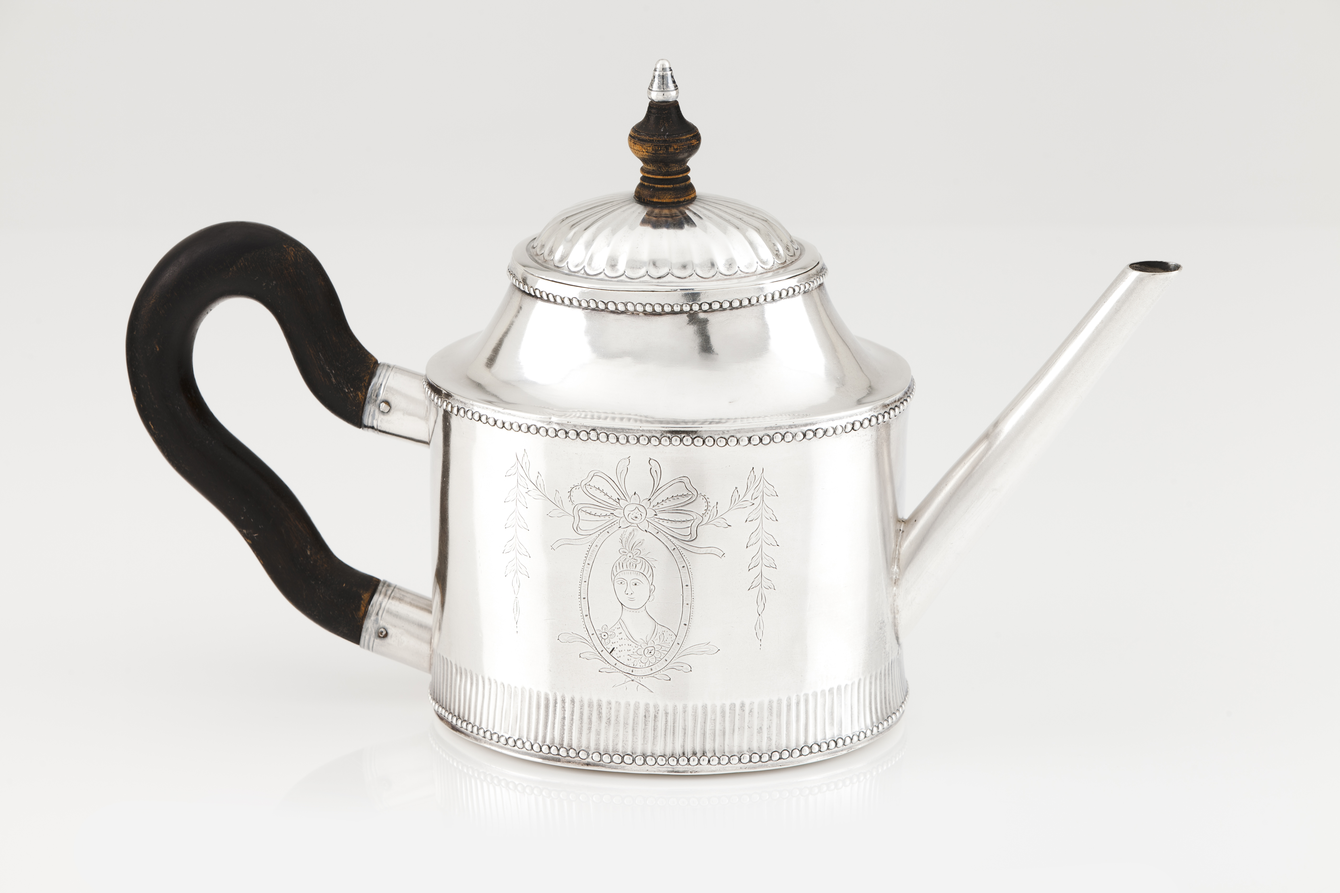 Corpo ovalado, cinzelado com medalhão com figura masculina encimado por laço, fitas e ramagem