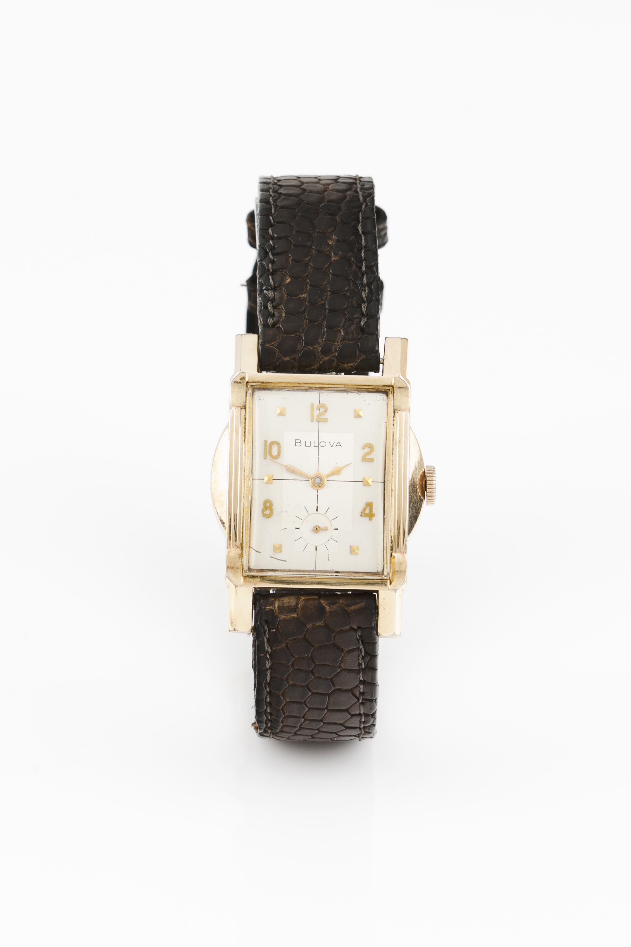 Relógio de marca Bulova. Movimento mecânico de corda manual. Caixa em plaqué com tampa em aço. Razoável estado de conservação.