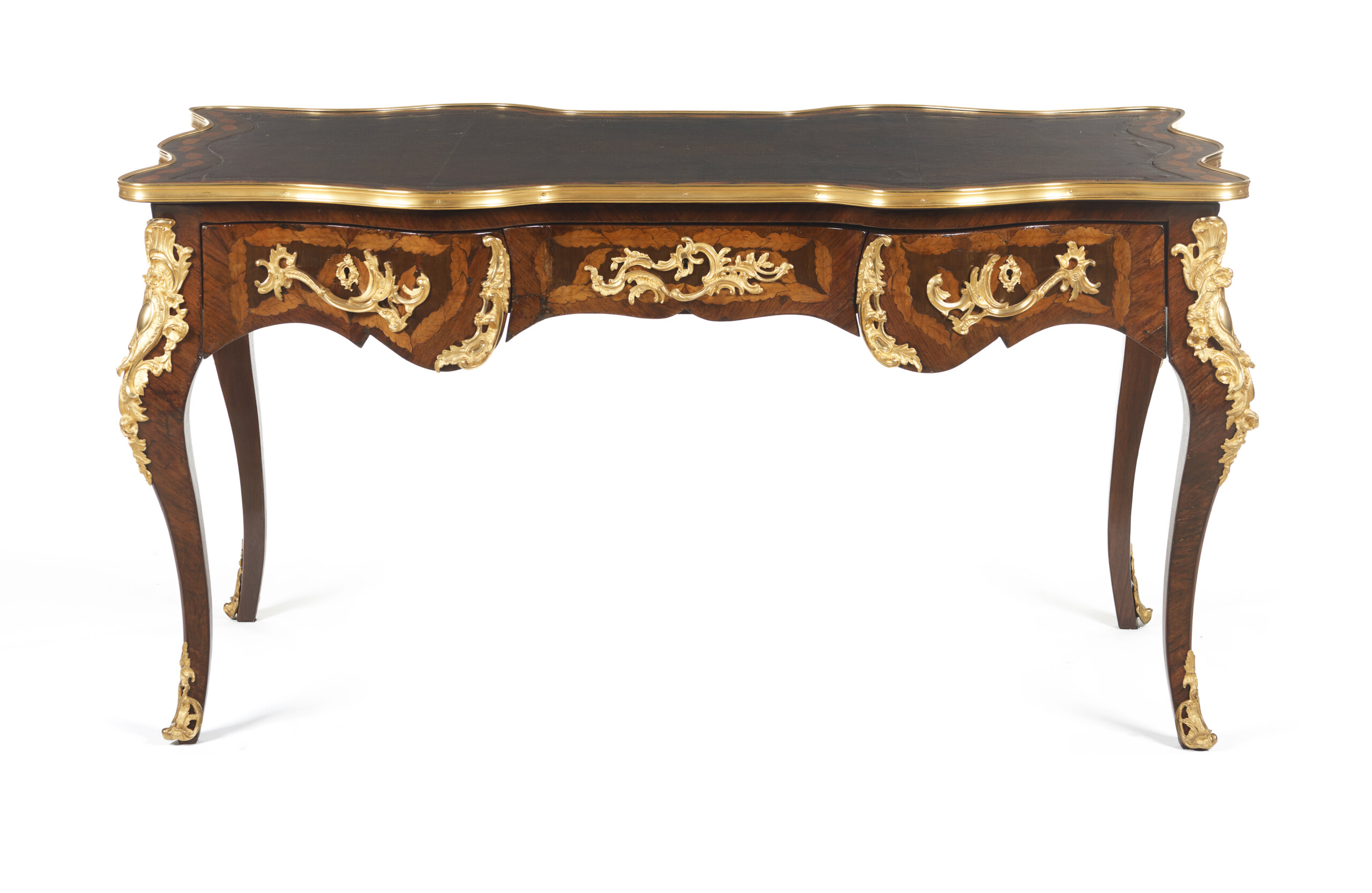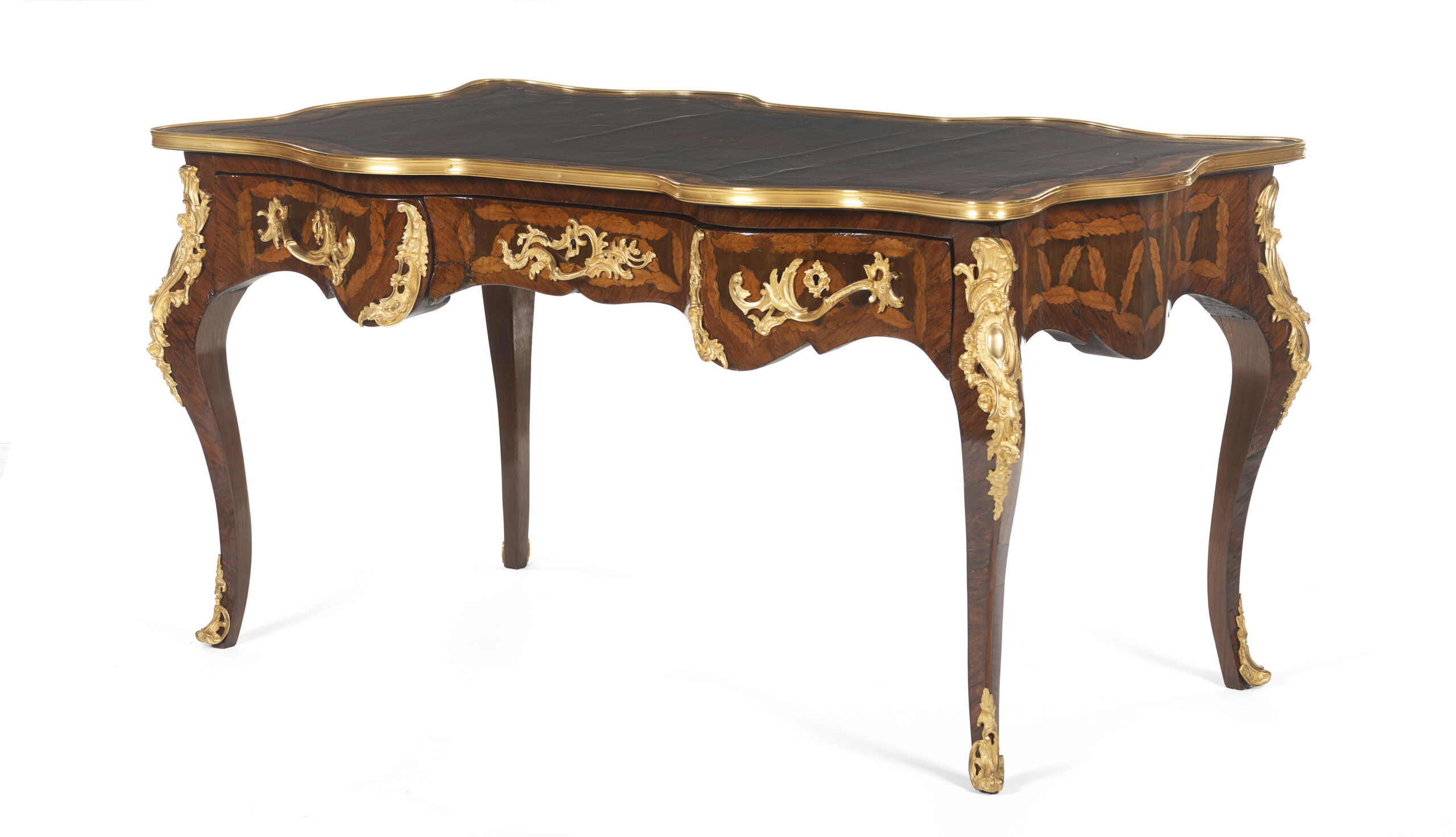 Em madeira faixeada com trabalho de marchetaria em pau-rosa representando folhas