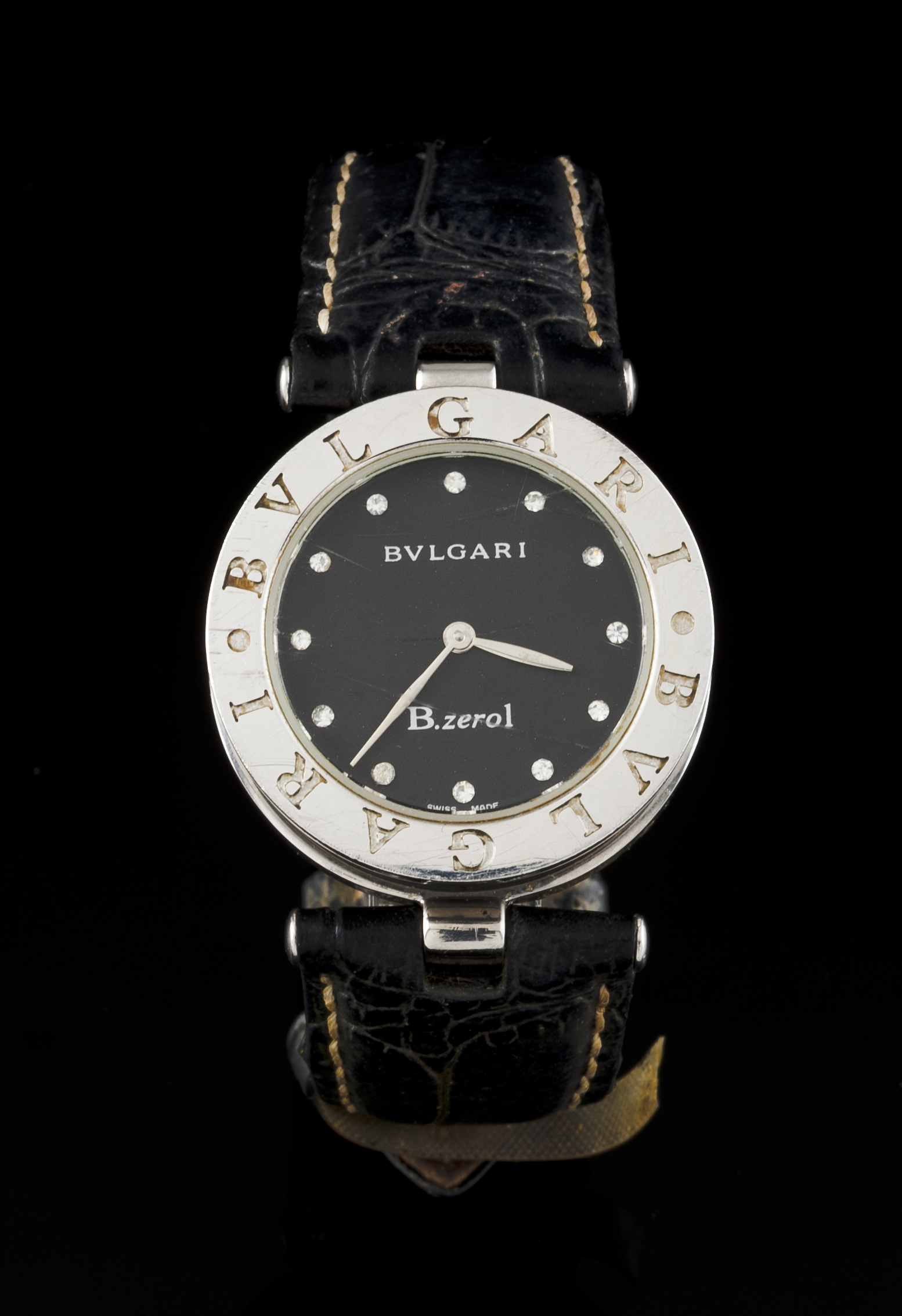 Modelo B. Zero 1. Movimento de quartzo. Caixa em aço com 12 brilhantes nos índexes. Com marcas de uso.