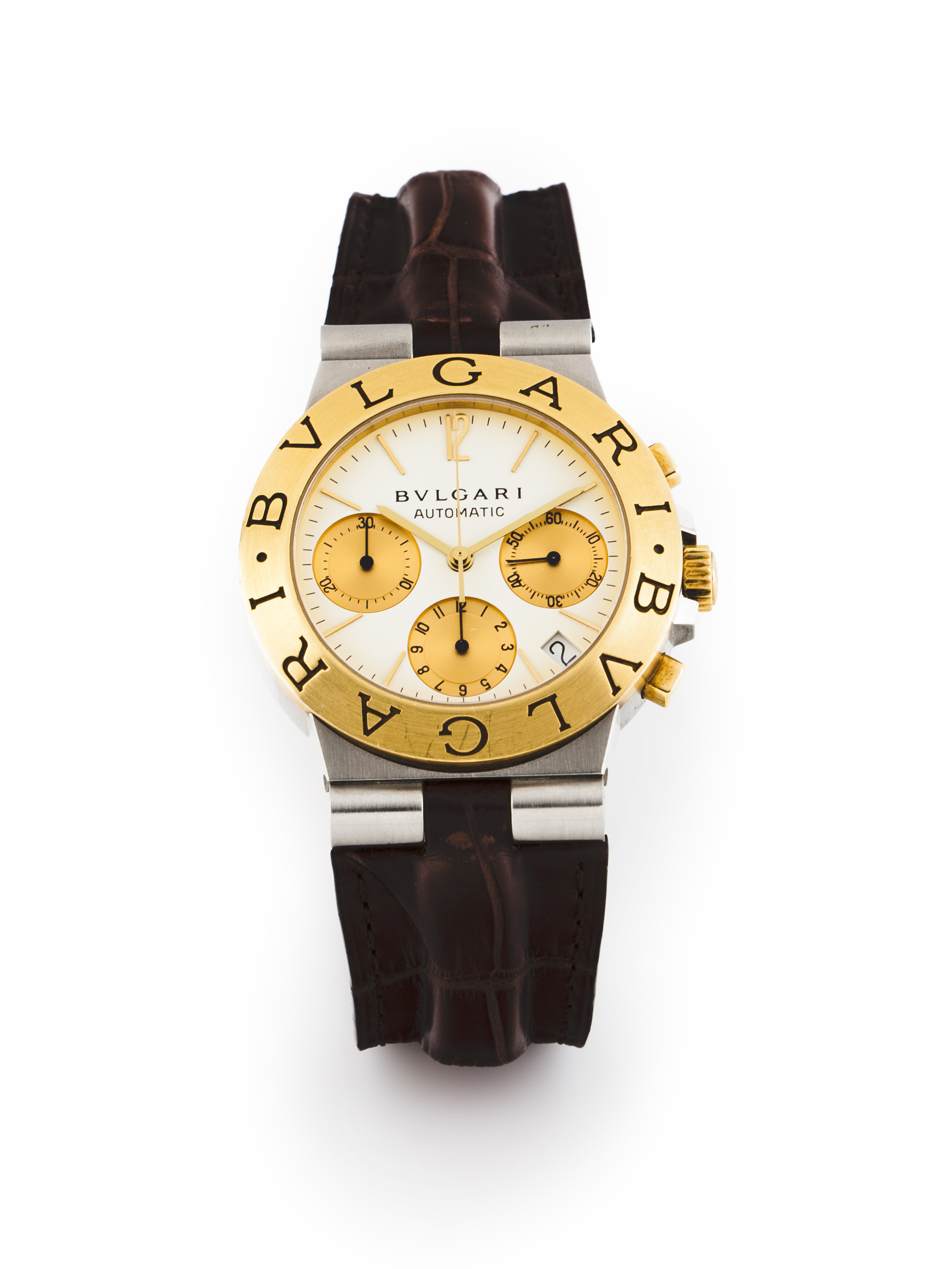 Modelo Diagono. Movimento mecânico automático com função cronógrafo e data às 16h/17h. Caixa em aço e ouro. Em bom estado de conservação