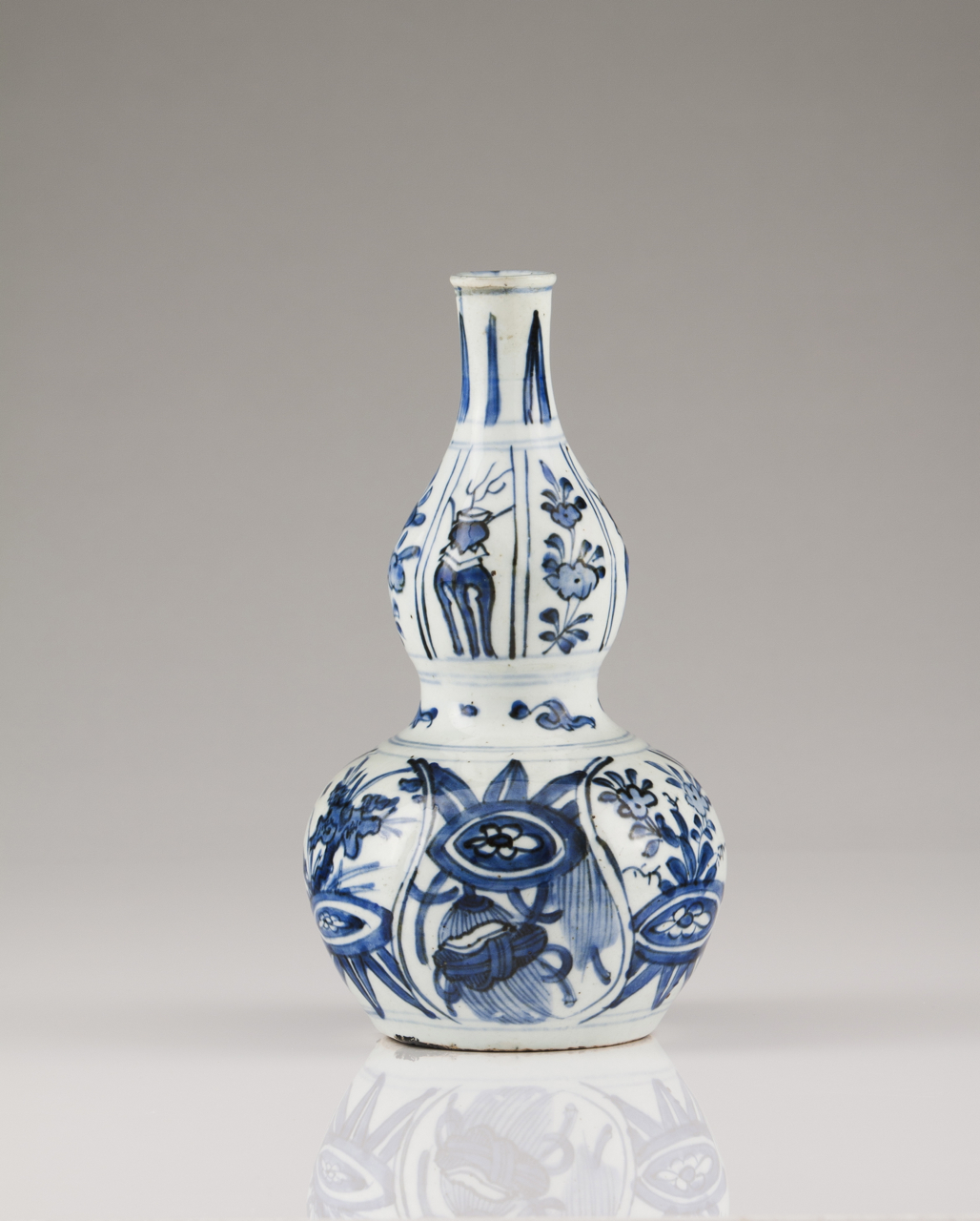 Decorada a azul sob vidrado com motivos vegetalistas e objectos preciosos
