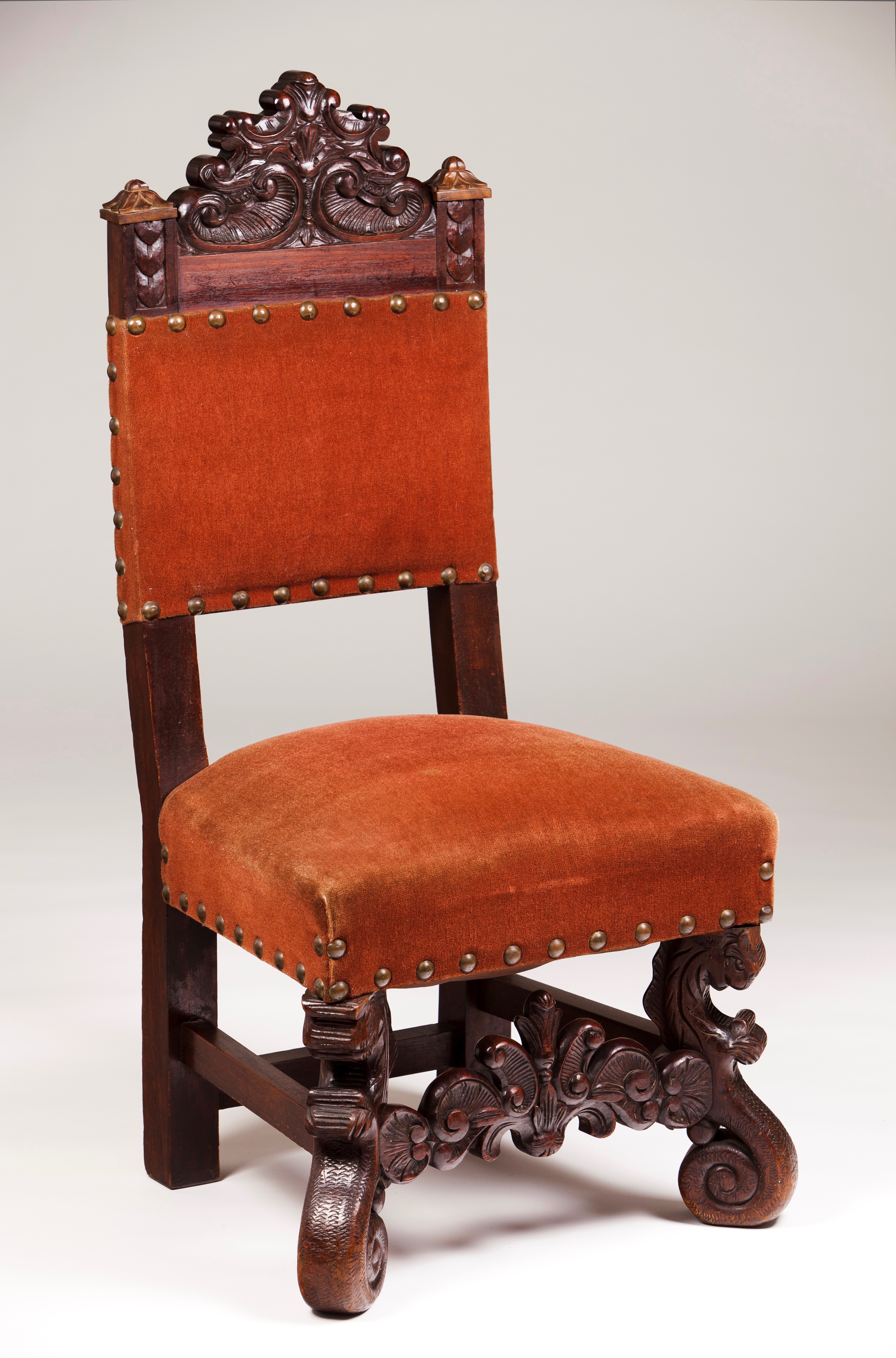 Costas e assento estofados a veludo com pregaria de metal amarelo