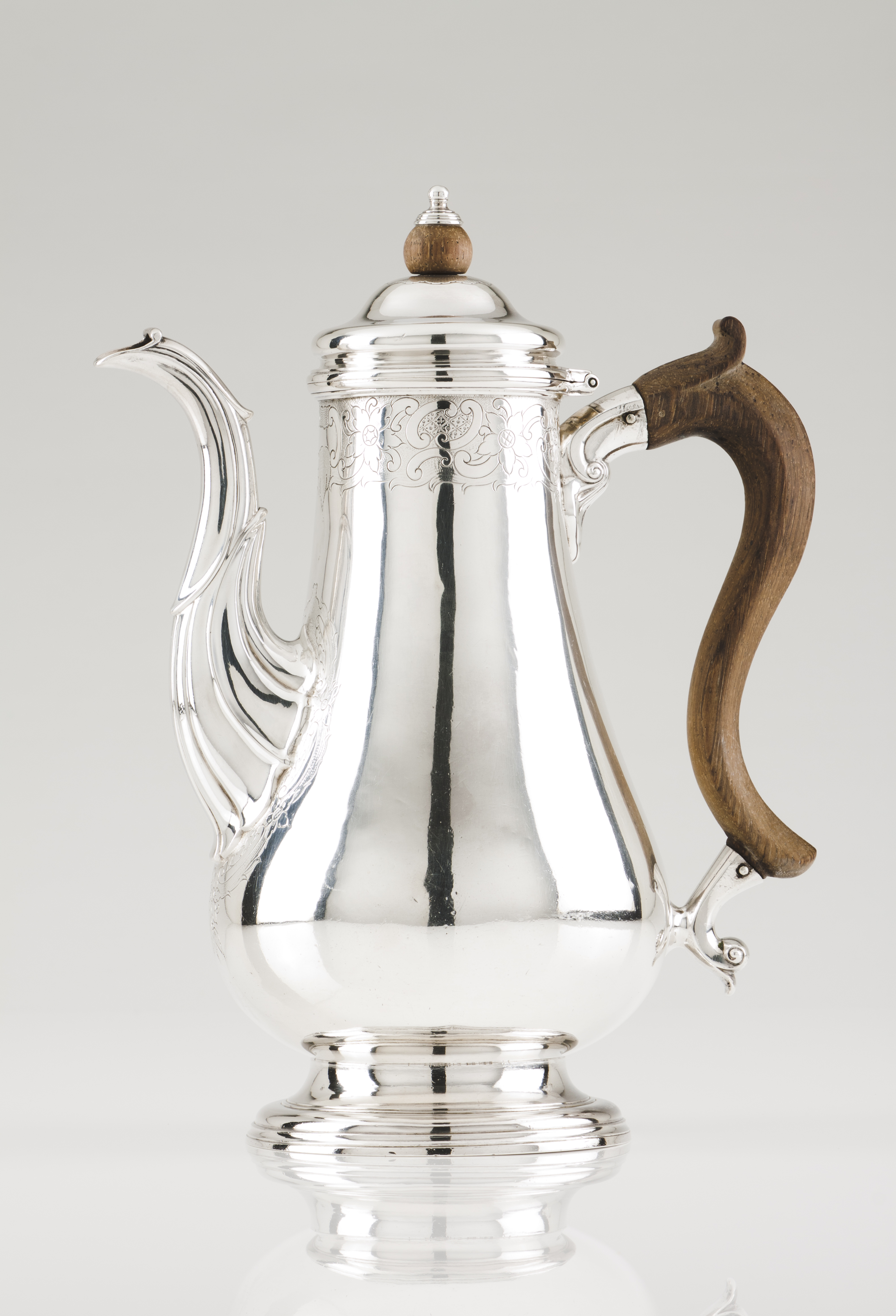 Bico em colo de cisne com remate de folha, concheados na base e cinzelado na união com o bojo