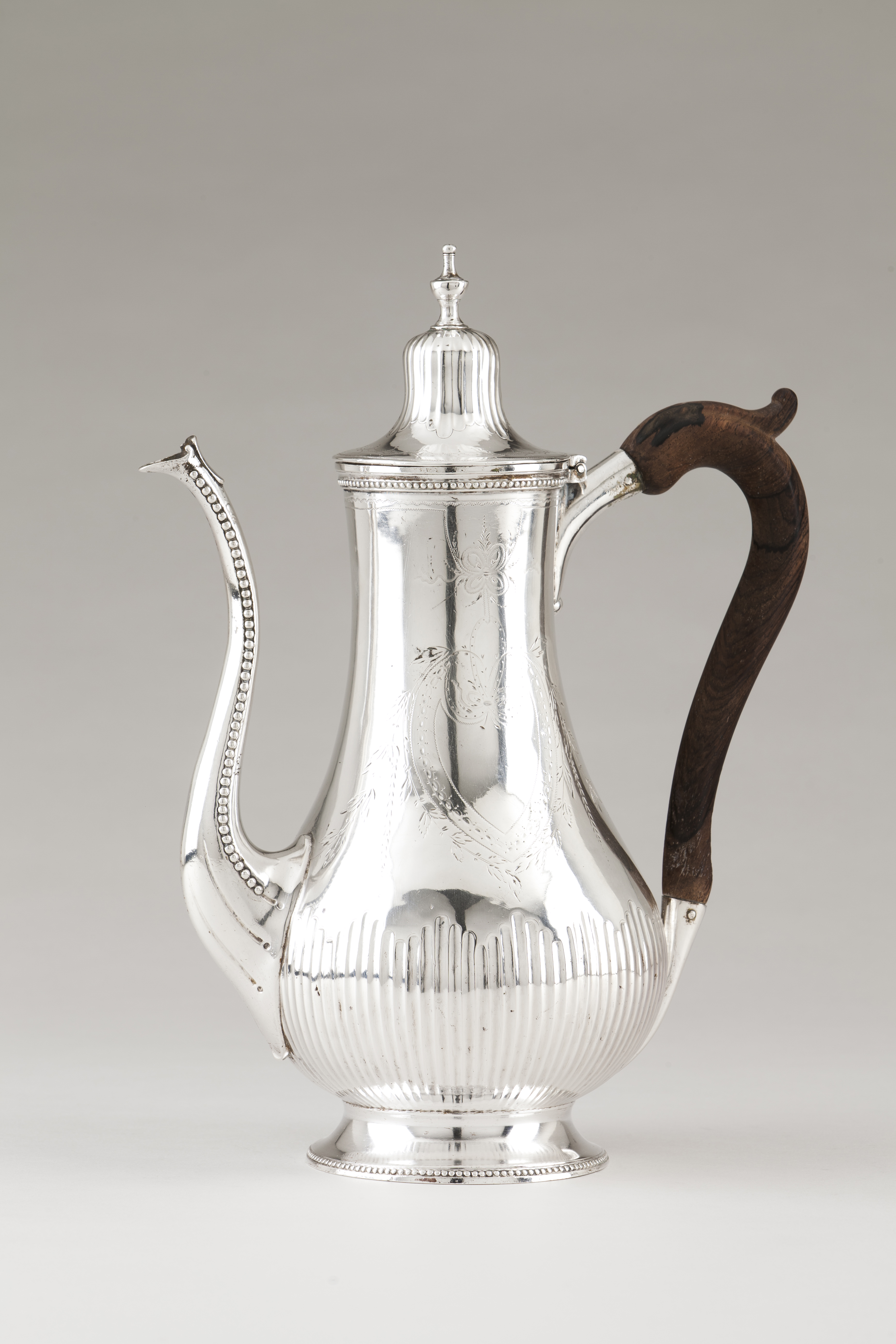 Corpo periforme parcialmente canelado e cinzelado com motivos de inspiração vegetalista formando reservas lisas em forma de coração Bico em cole de cisne com friso perelado, pega em madeira entalhada e botão de tampa em urna e pé circular com cercadura conteada