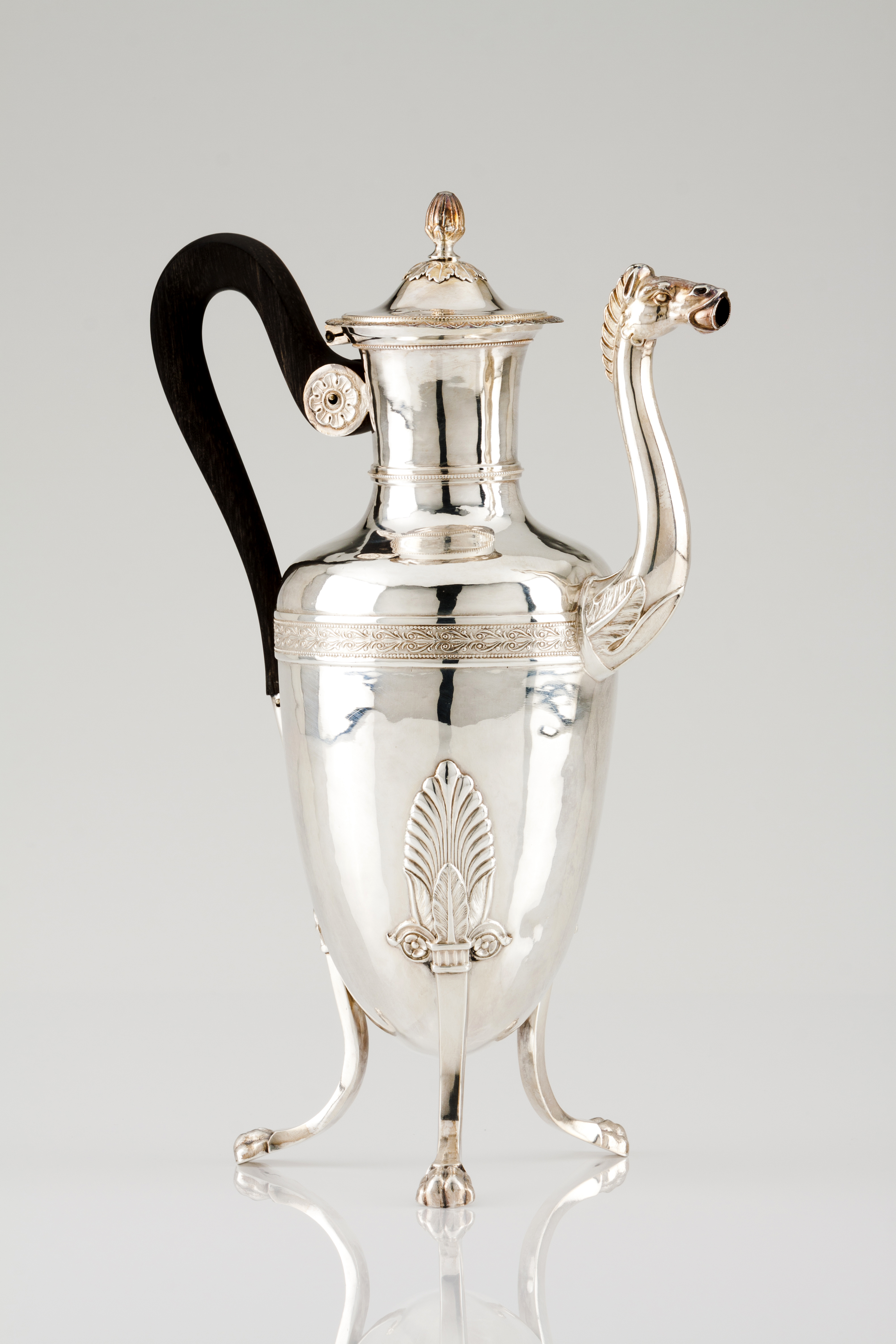 De formato ovoide com estrangulamento ao nível ombro assente sobre 3 suportes facetados terminando em pés de garra com elemento decorativo de folha na junta. Bordo com banda de palmetas, bico de cabeças de cavalo, pomo de bolbo e paga em madeira ebanizada.