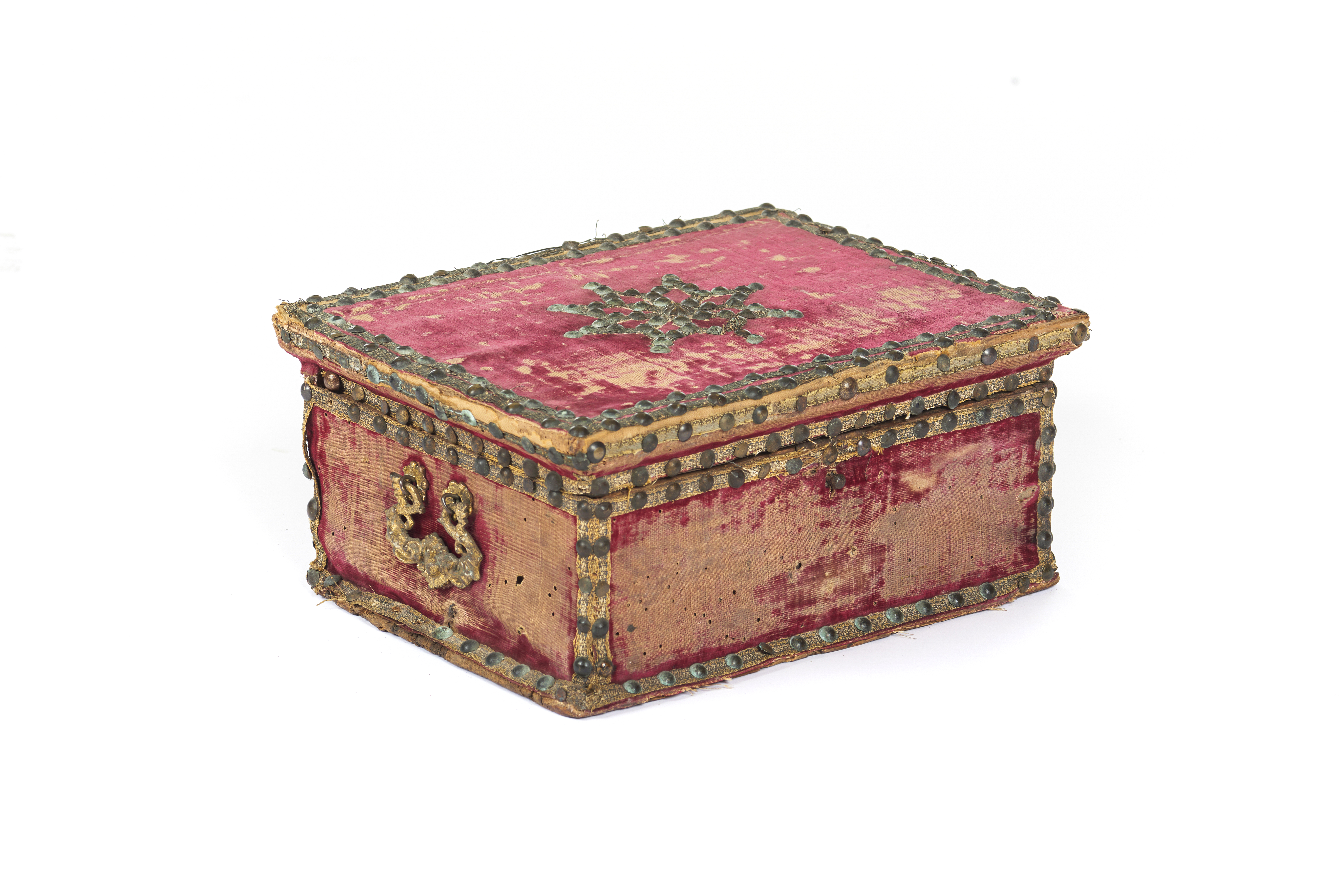 Em madeira revestida a veludo com pregaria e puxadores em metal