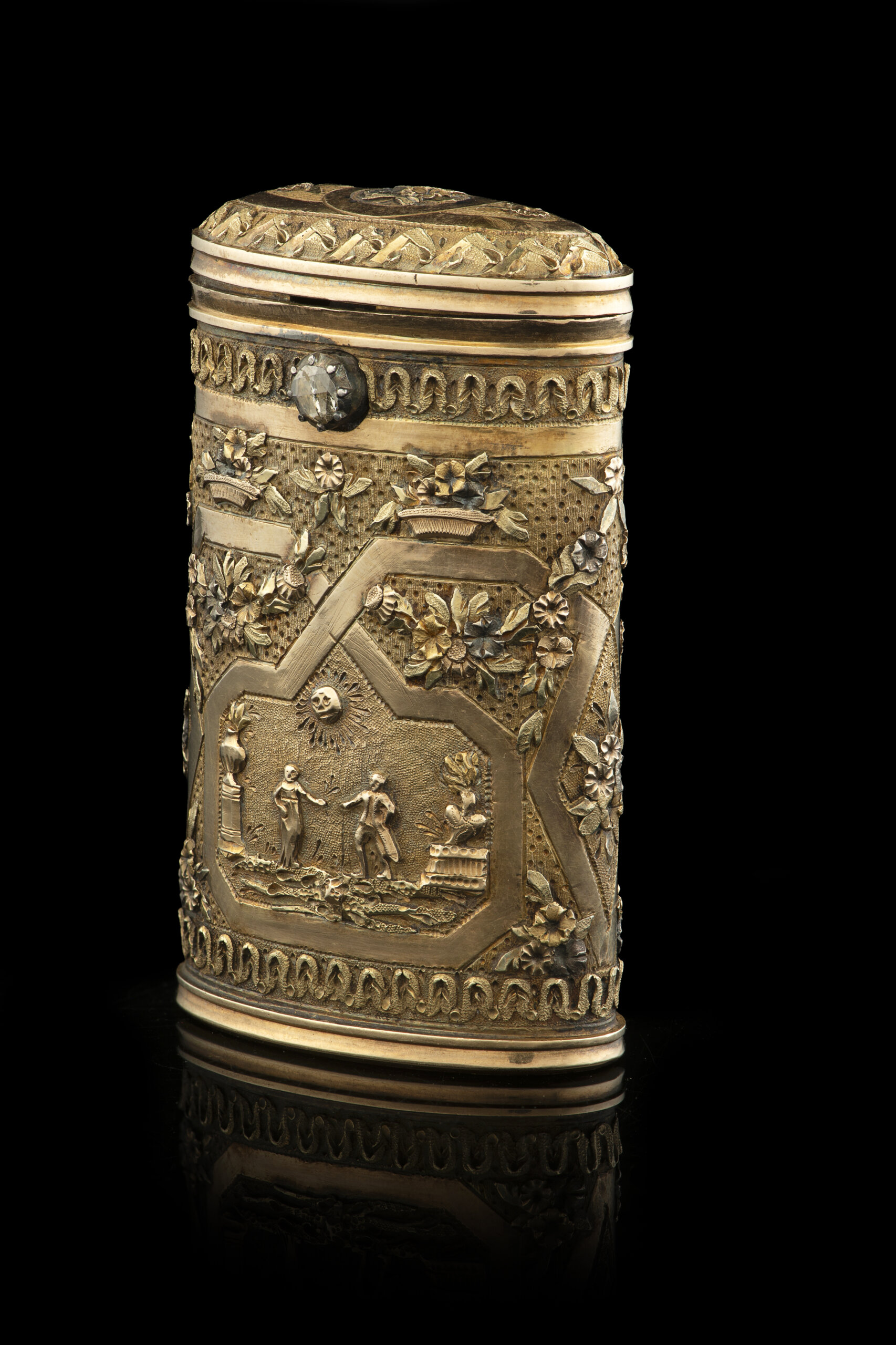 Decoração cinzelada com elementos vegetalistas e cena com figuras