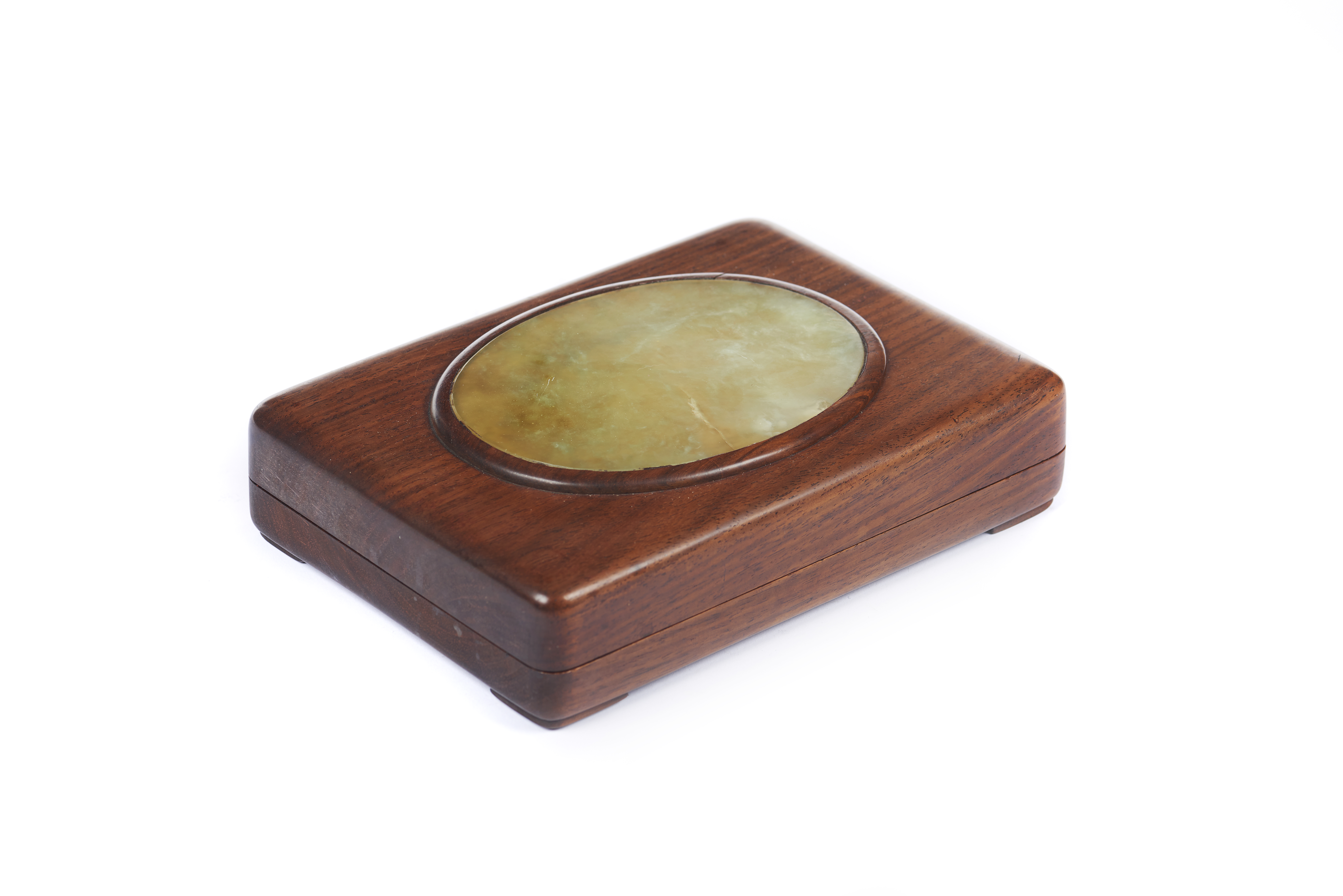 Em madeira de lei, de formato rectangular e com placa de mármore de formato oval embutida na tampa.