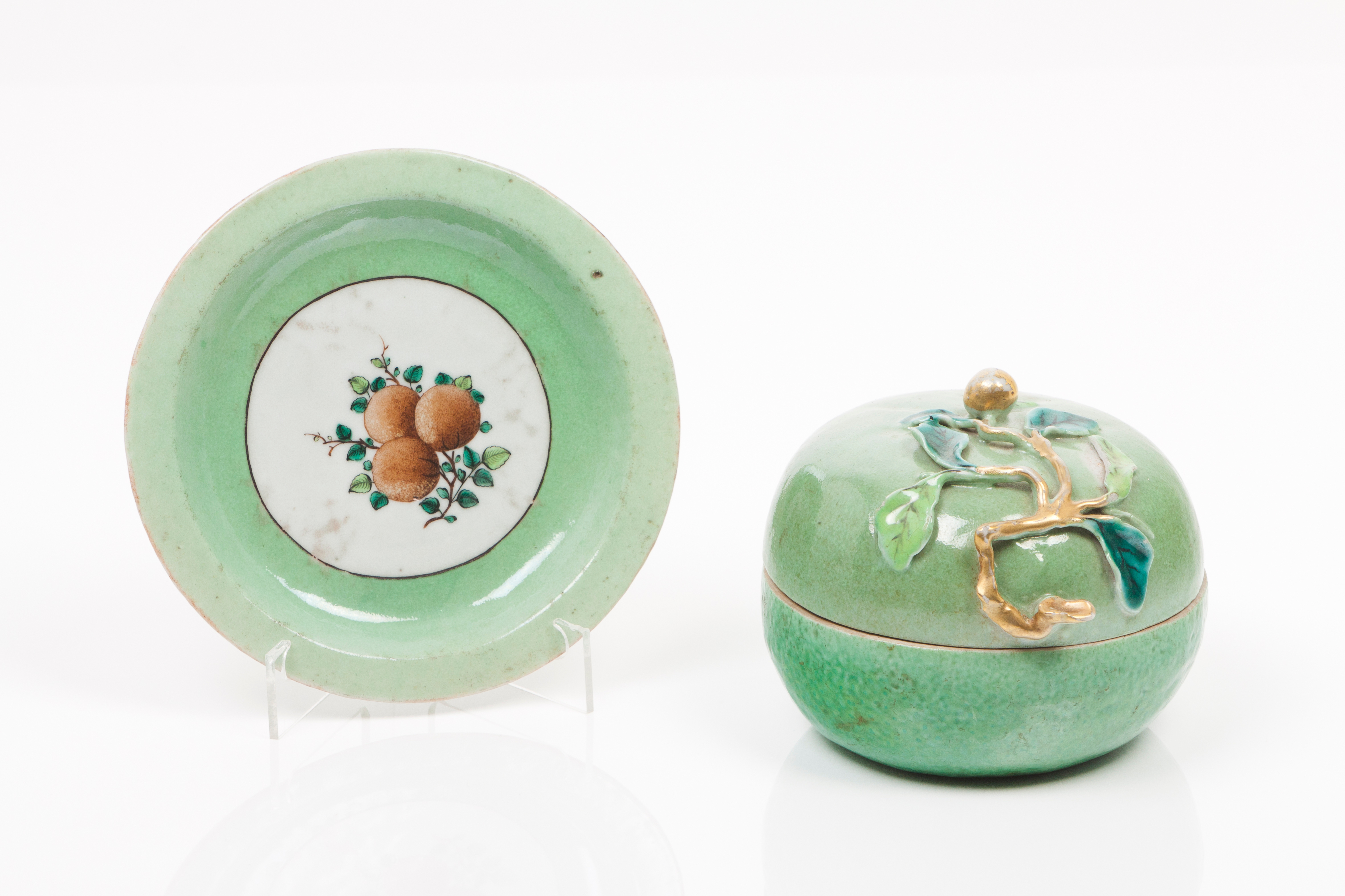 Presentoir com decoração policromada, representando ao centro ramo com fruto e folhas