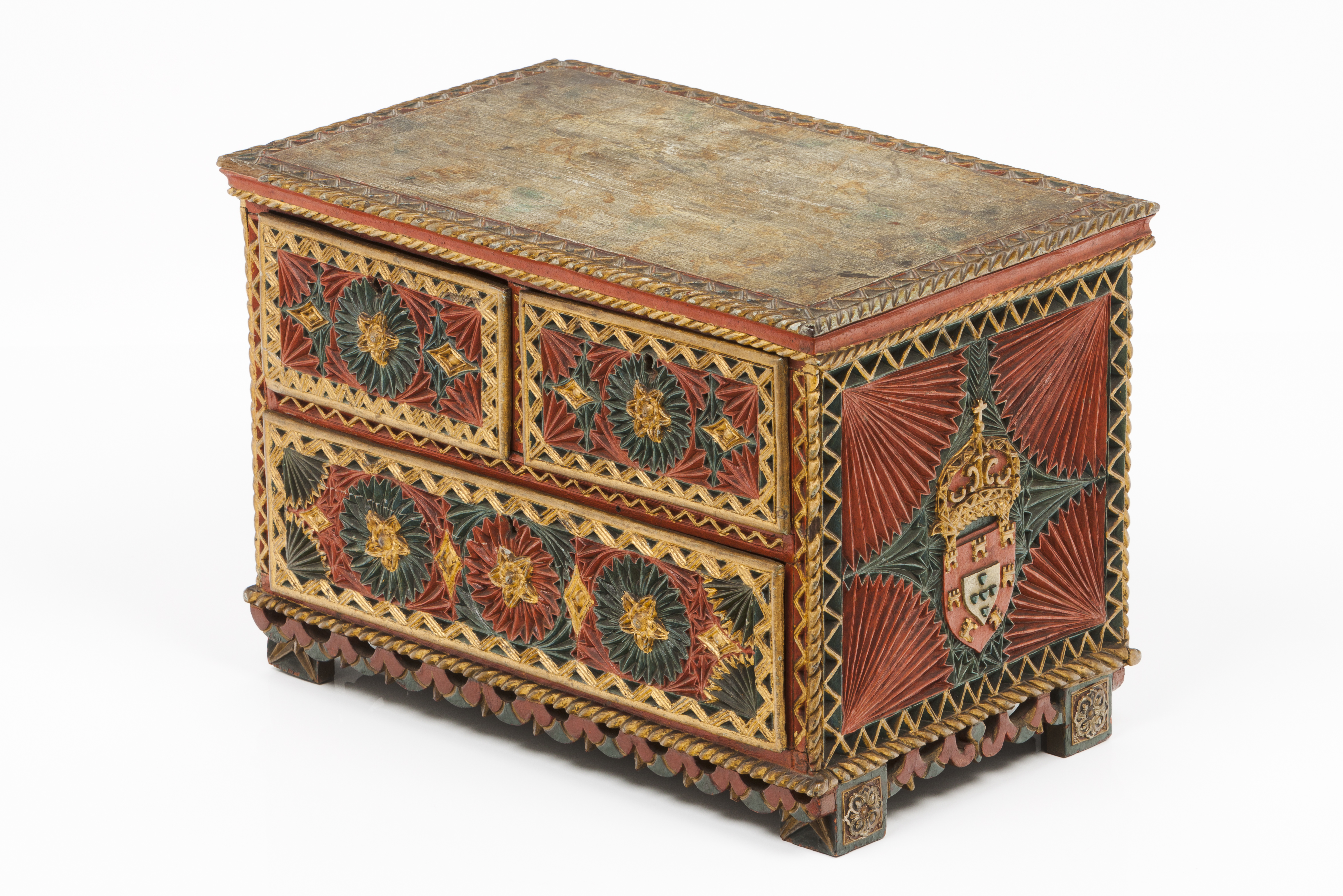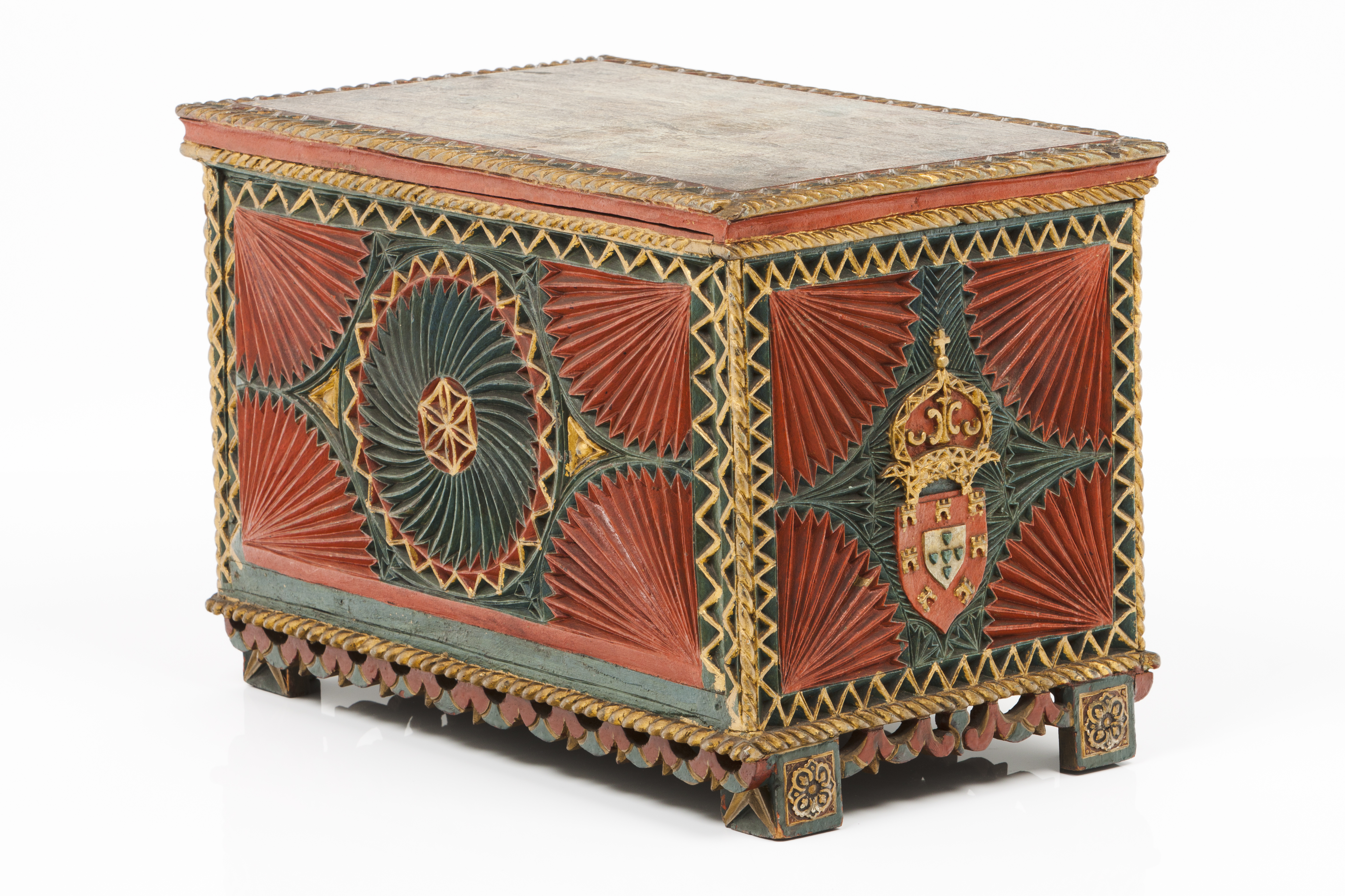 Em madeira policromada com dourados decorado com padrão geométrico tendo nas laterais as armas de Portugal