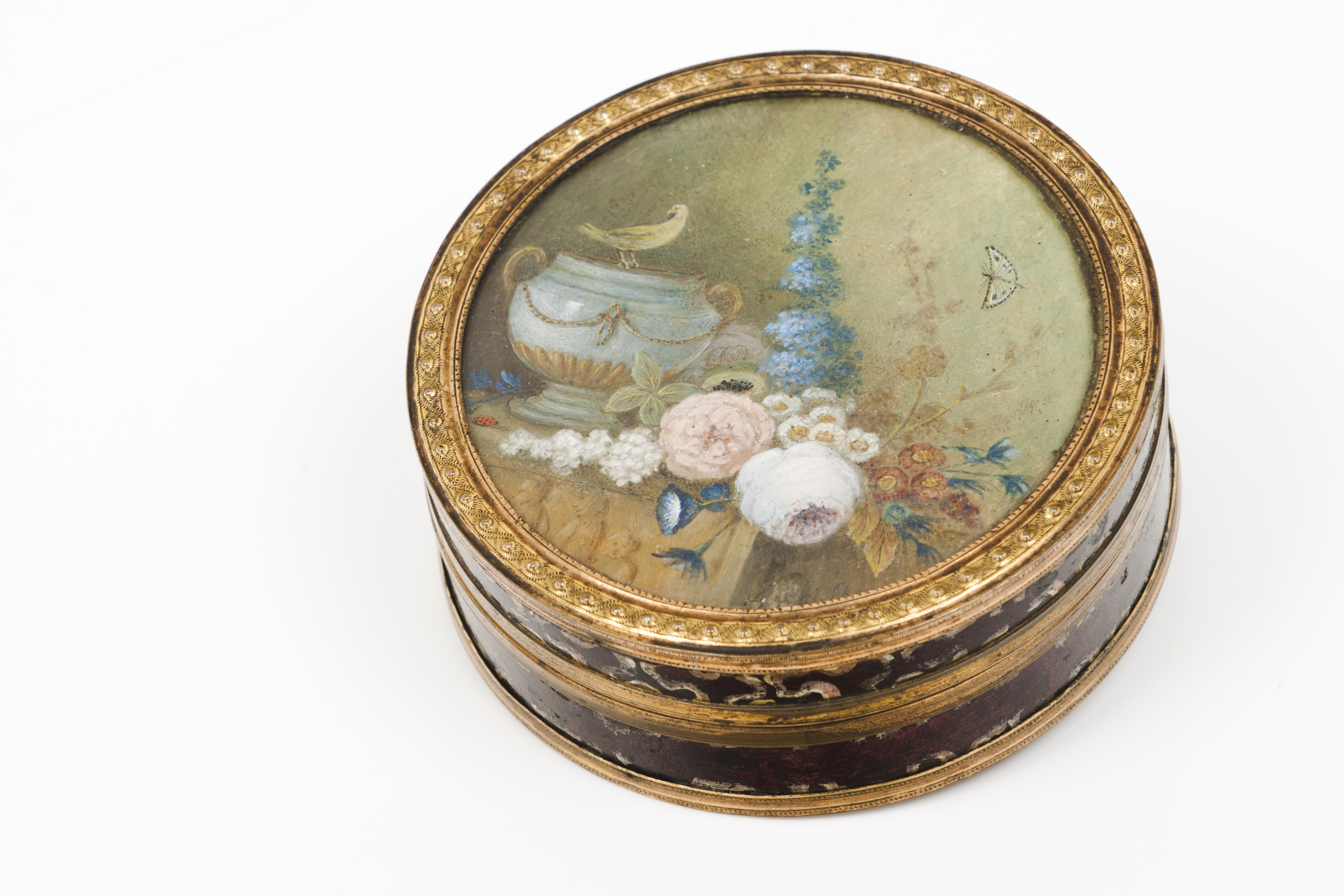 Tampa com pintura representando natureza morta