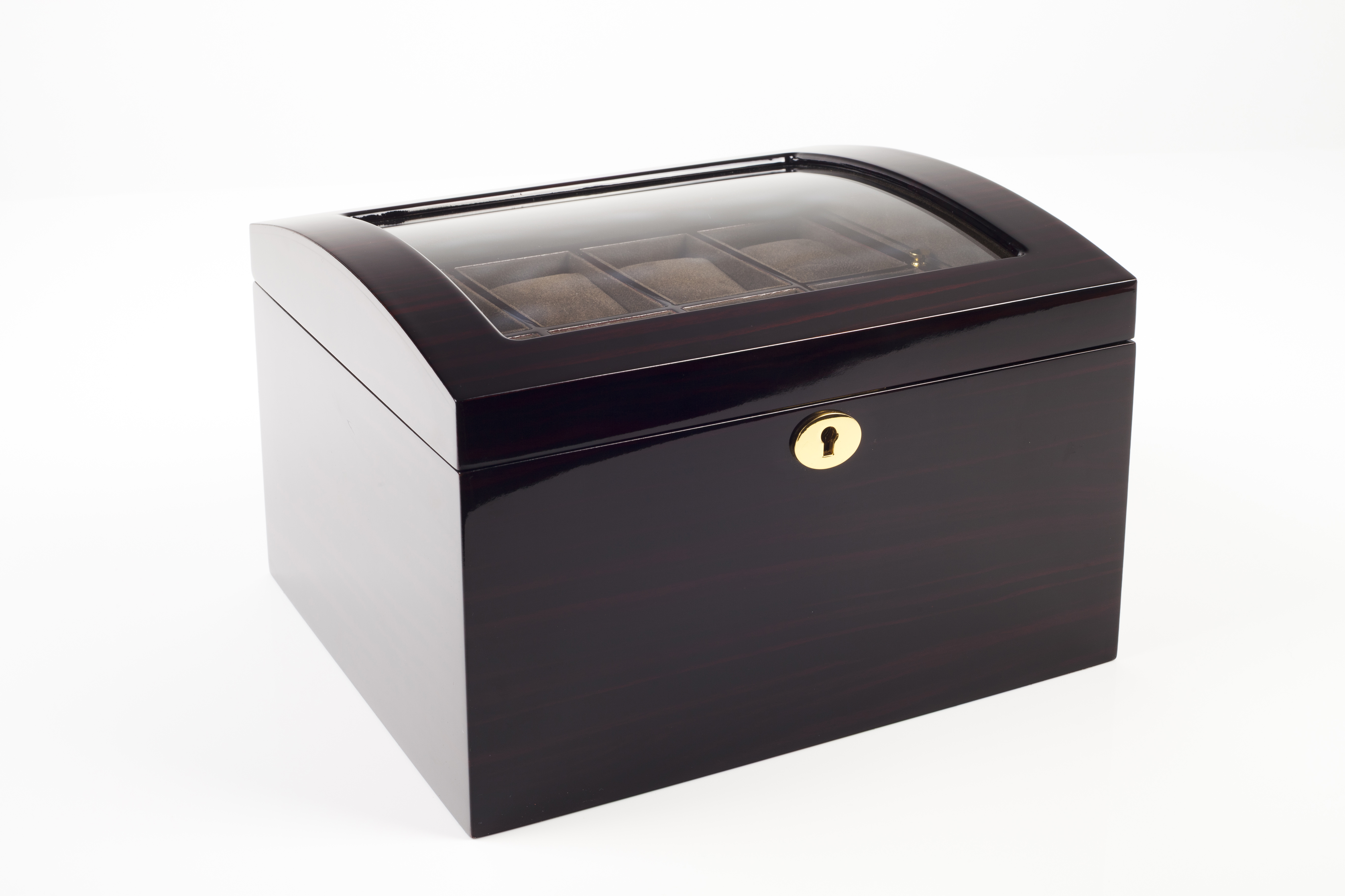 Caixa em madeira com vidro na parte superior para acondicionar 16 relógios.