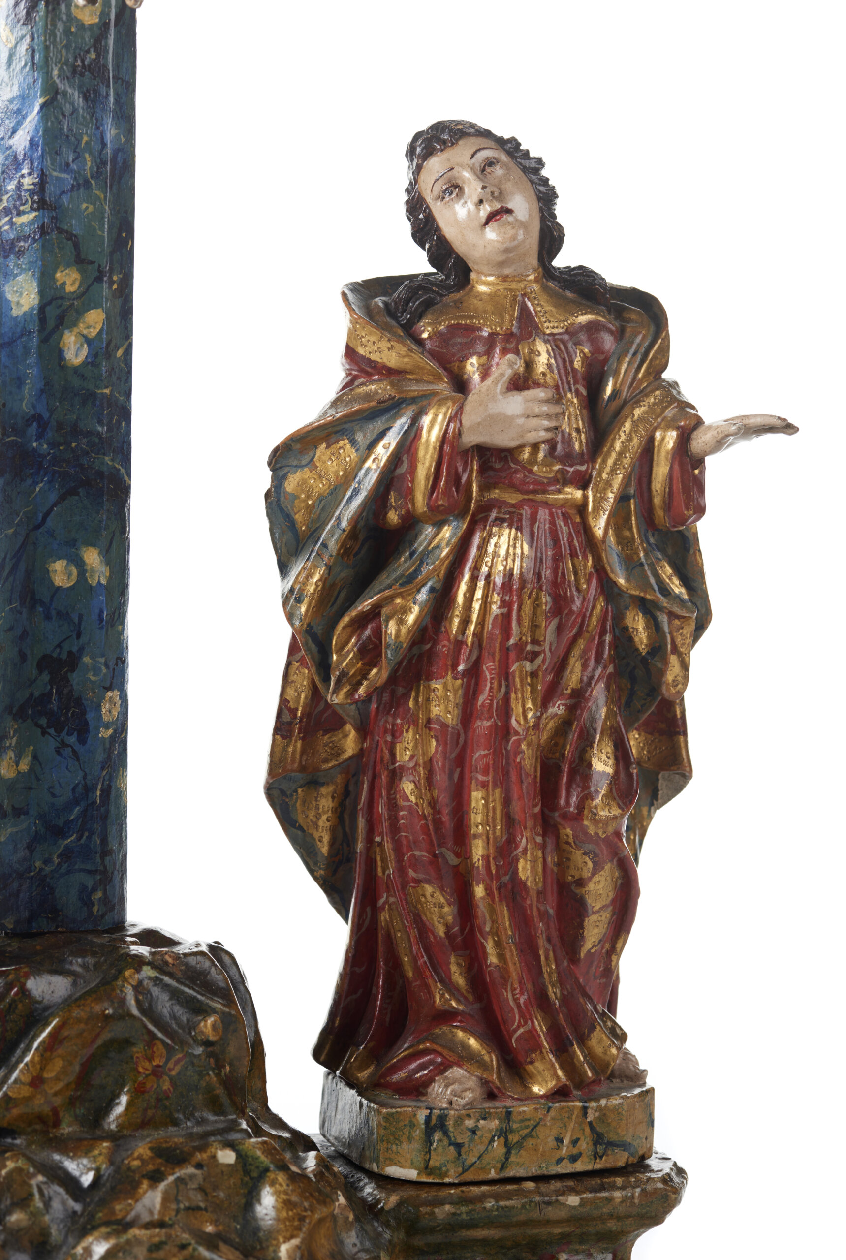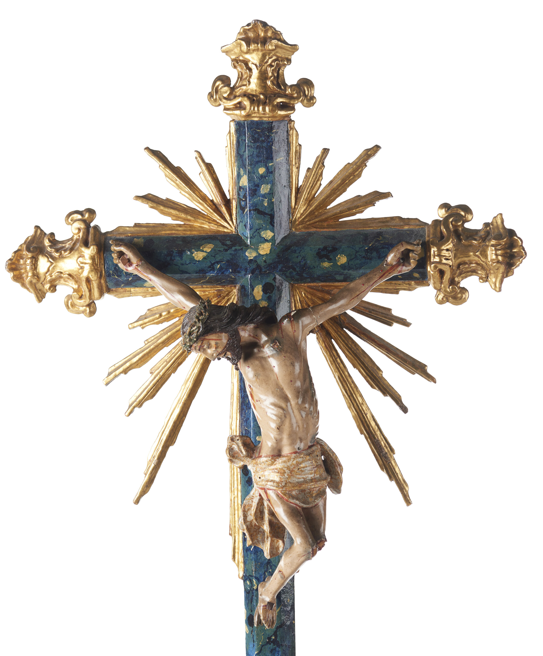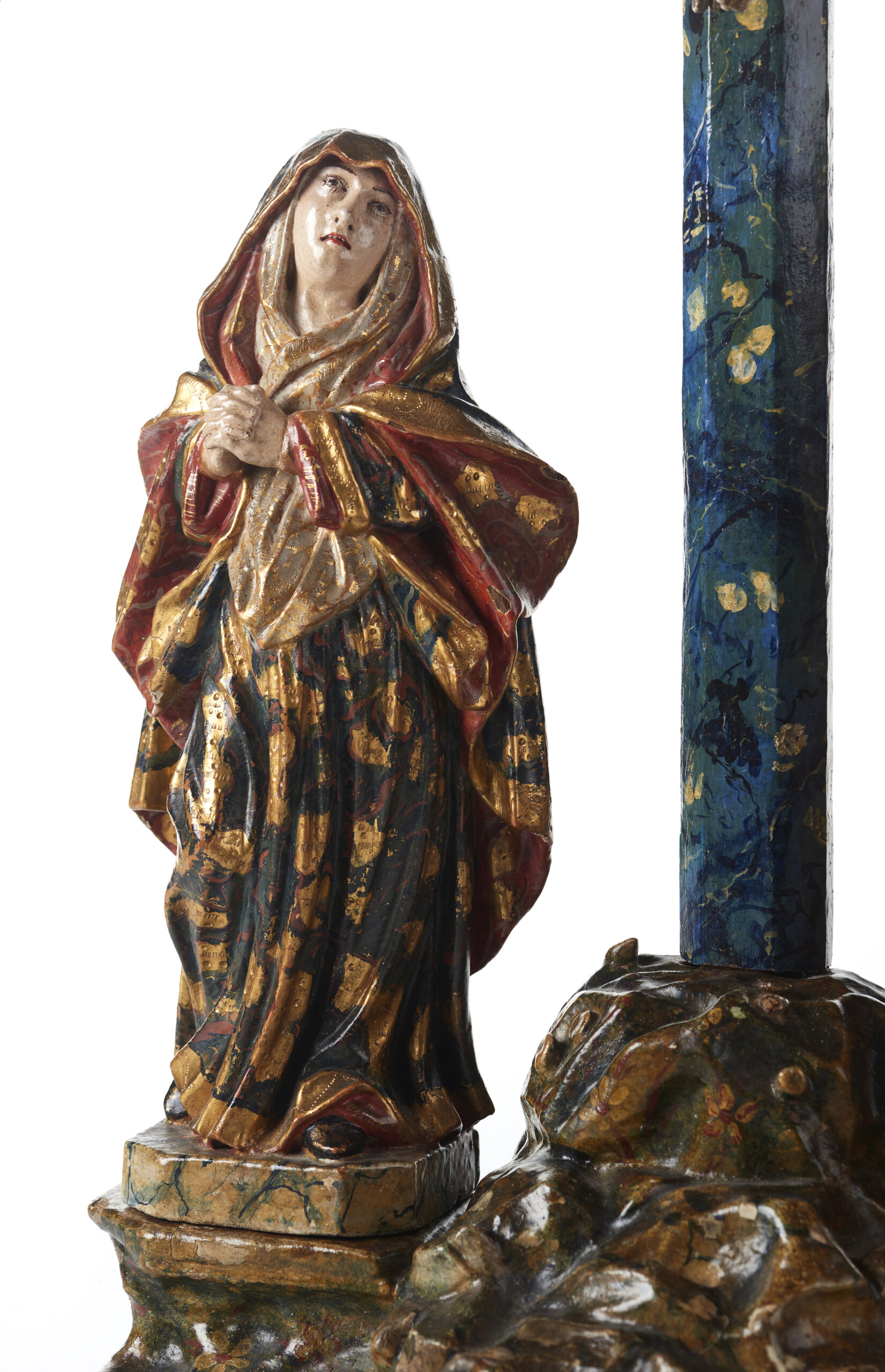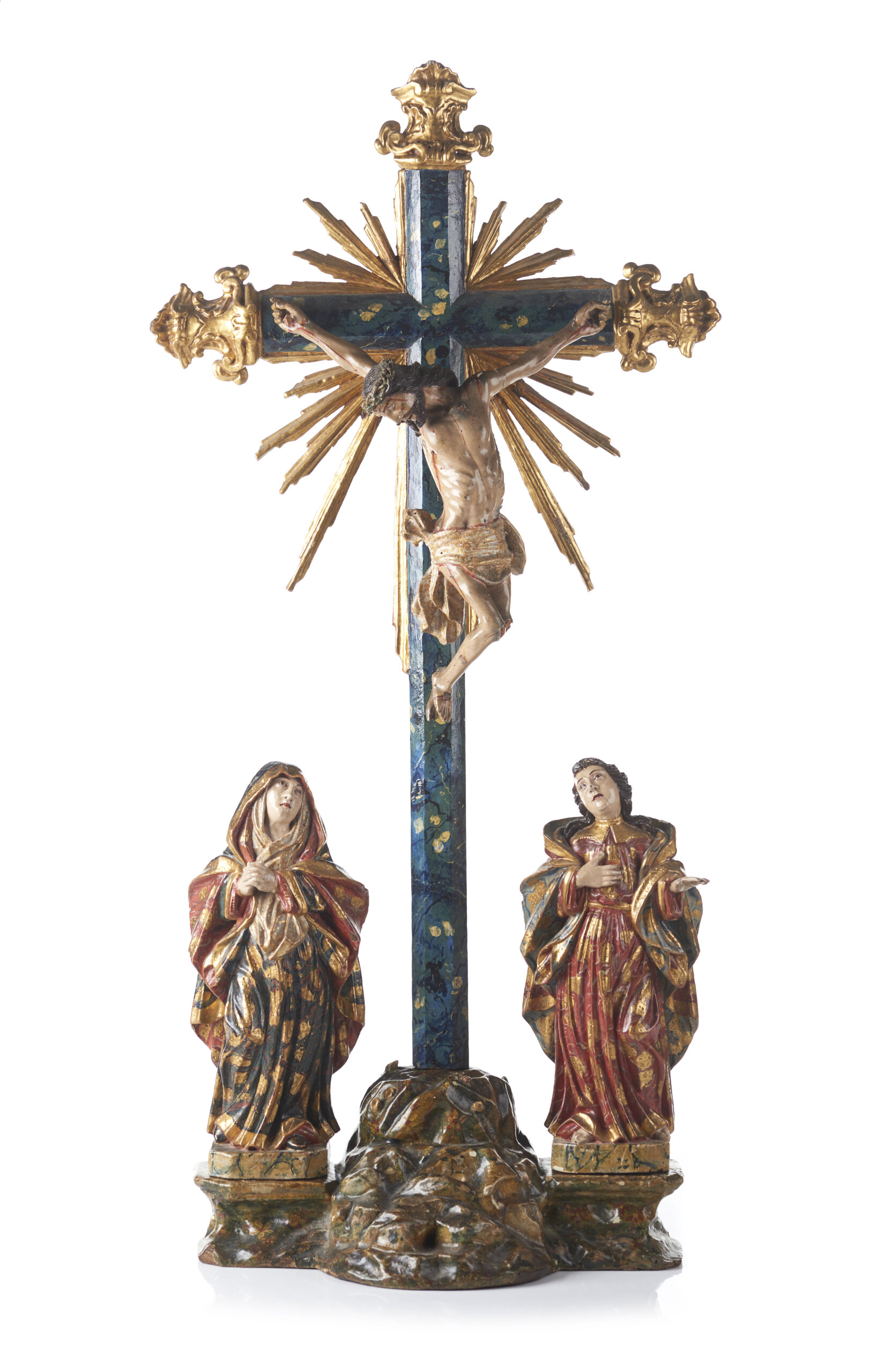 Jesus Cristo crucificado em cruz em madeira entalhada e pintada, tendo na base São João e Nossa Senhora