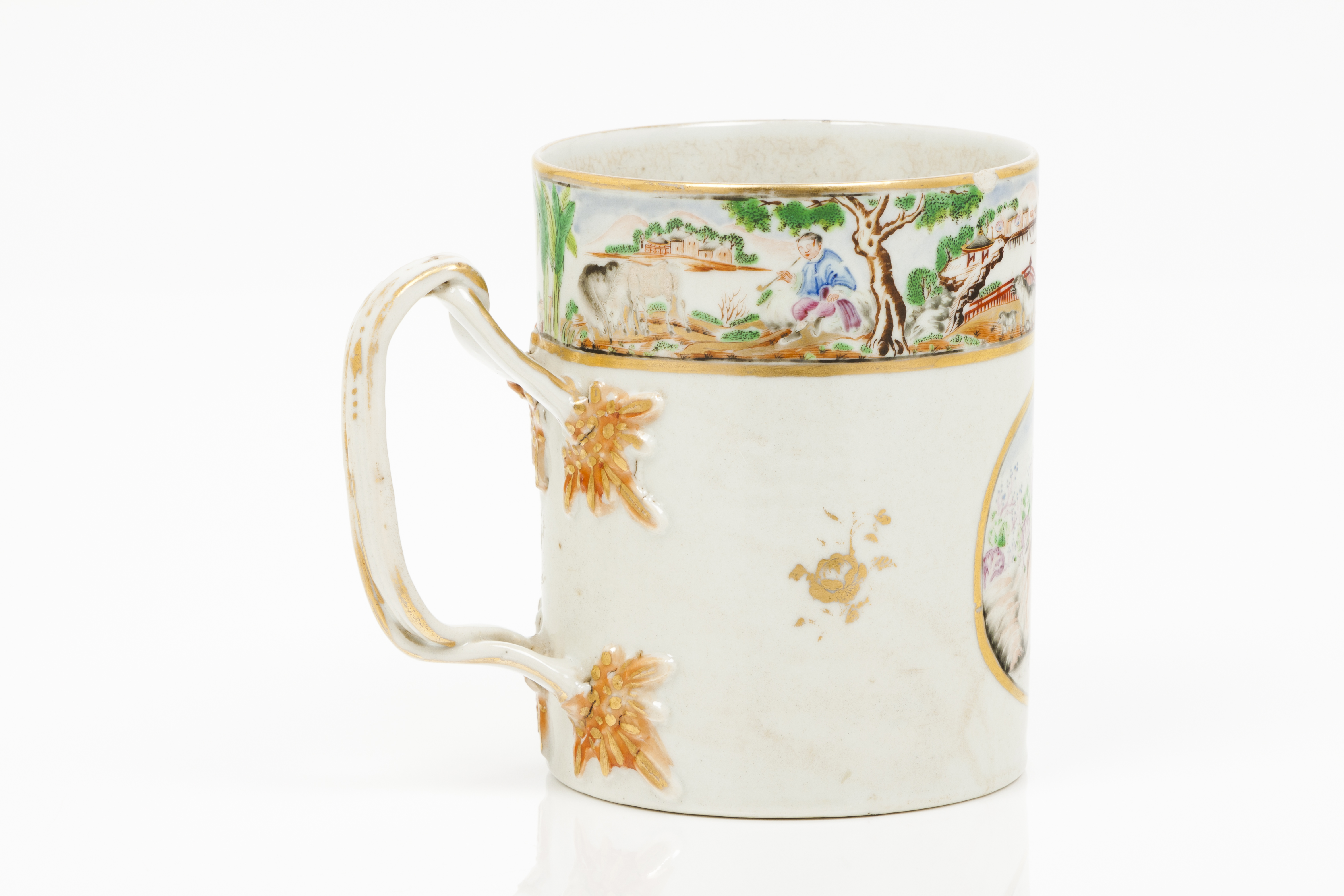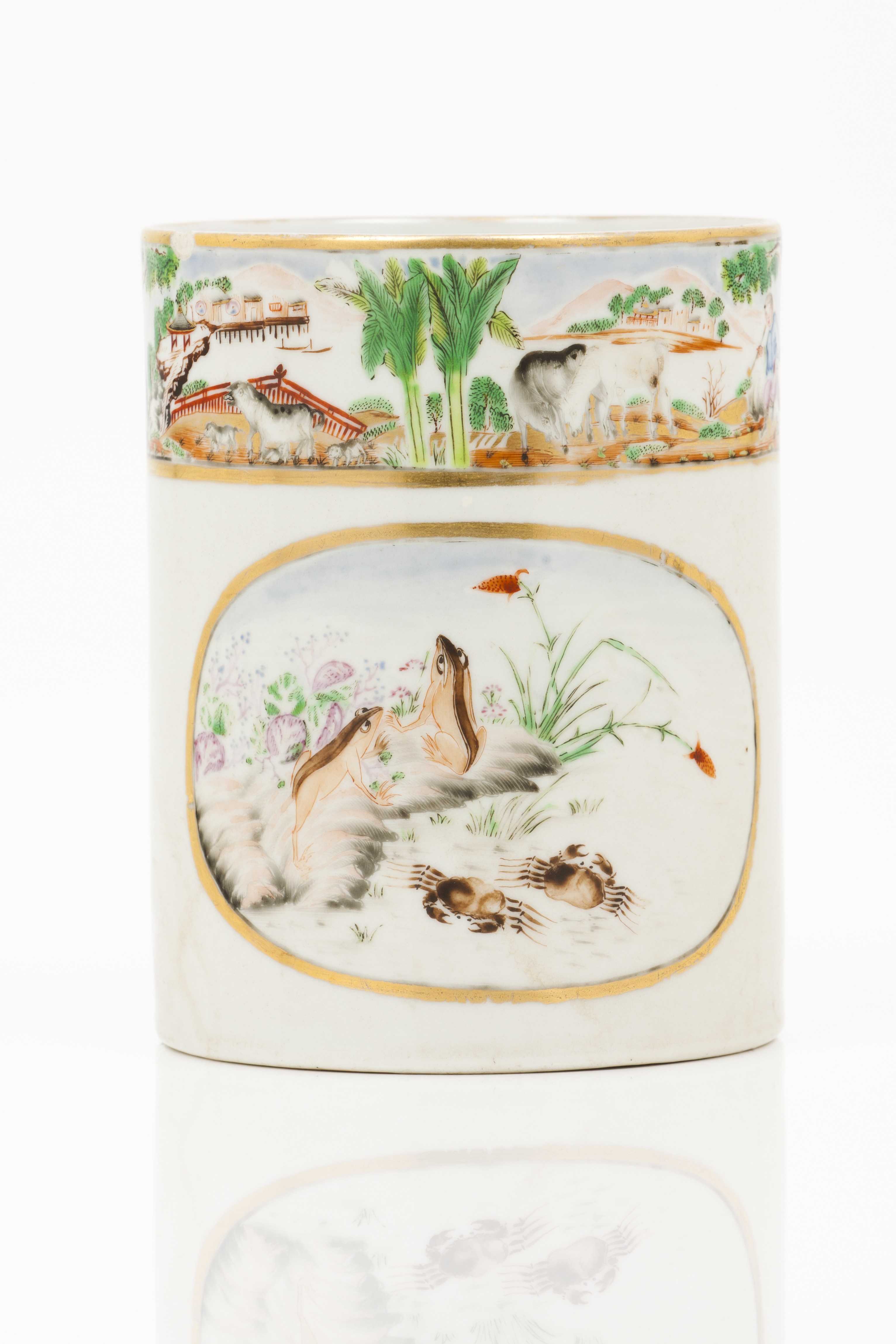 Decoração policromada e dourada com reserva representando rãs e caranguejos e bordo com paisagem representando pastores e gado