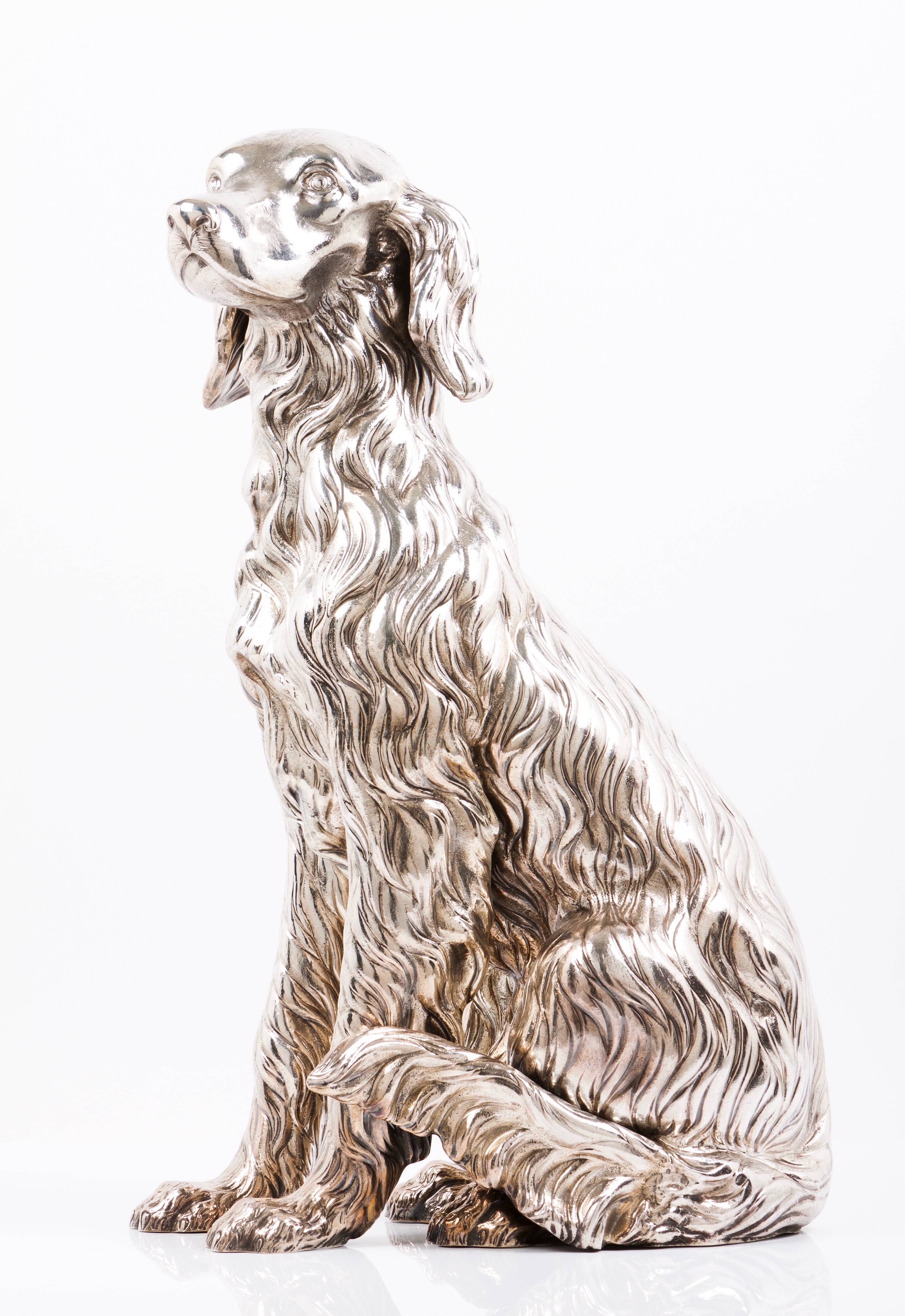 Escultura em prata relevada e cinzelada representando um cão sentado