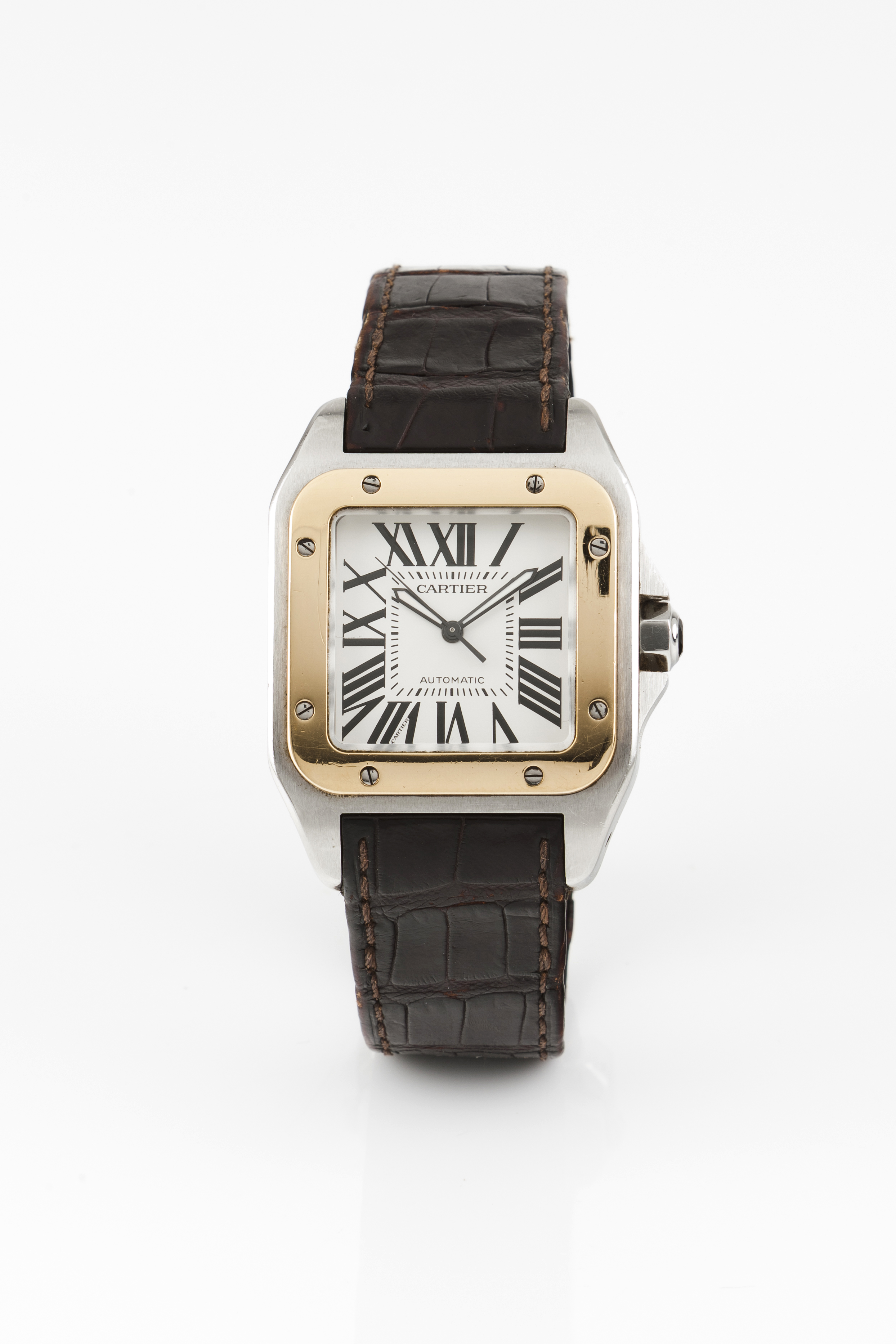 Relógio marca Cartier modelo Santos. Movimento mecânico automático. Caixa em aço e ouro. Com marcas de uso.