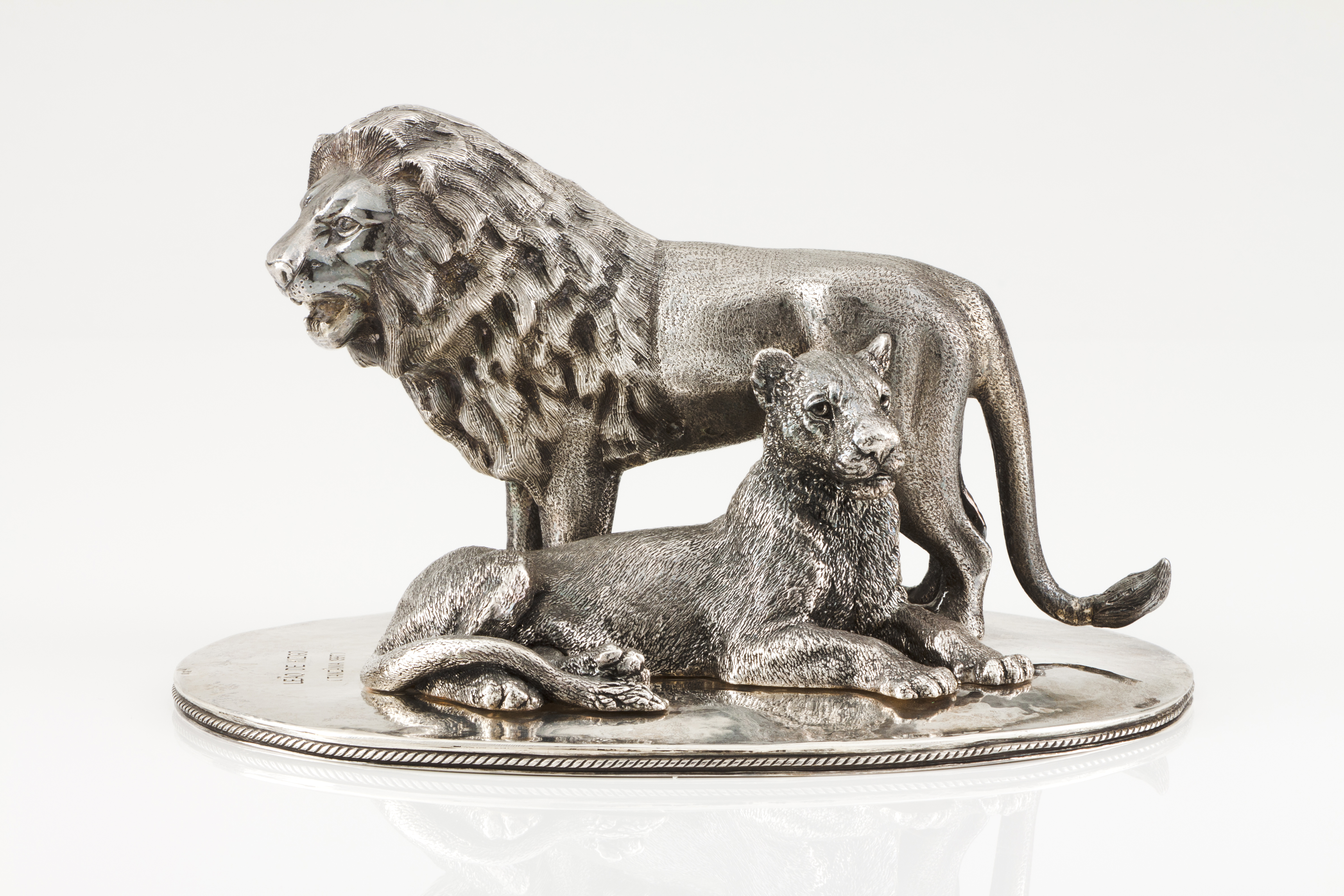 Escultura representando casal de leões de Kizigo (Tanzânia) em vulto perfeito assente em base oval