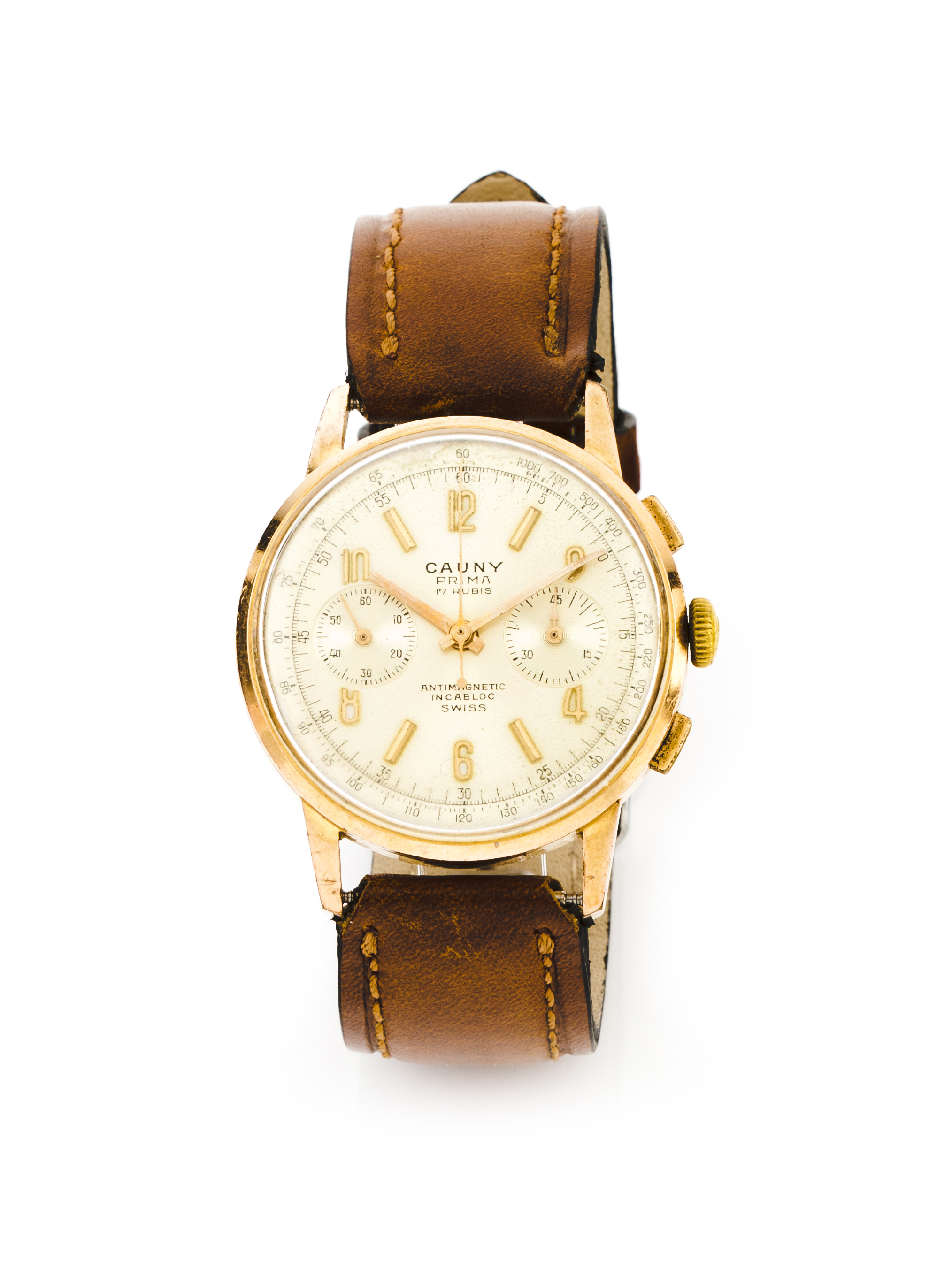 Modelo Prima. Movimento mecânico de corda manual (Landeron 248) com função cronógrafo. Caixa em plaquet com tampa em aço. Com marcas de uso.