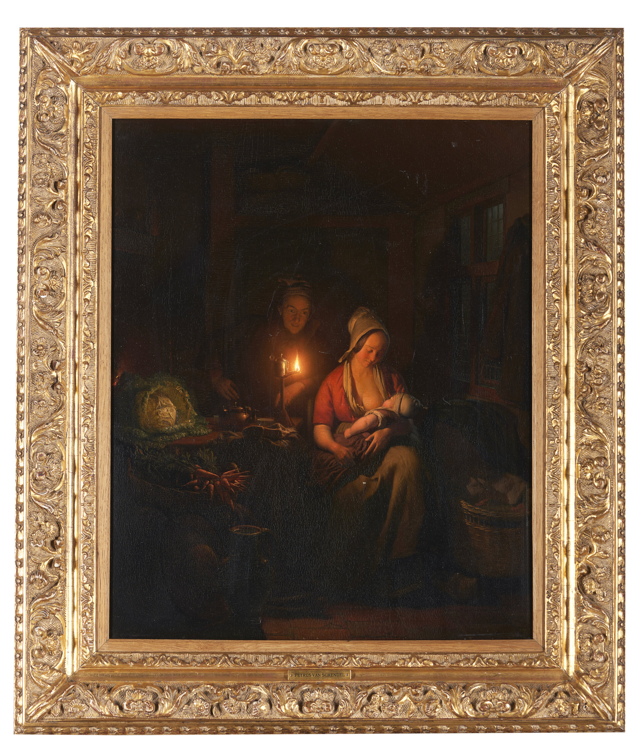 Composição noturna de interior, com elementos de natureza-morta e utensílios de cozinha, iluminados por uma única vela num castiçal. Em primeiro plano, uma jovem mulher sentada amamenta. Ao fundo, uma figura feminina mais velha observa a cena, parcialmente na penumbra