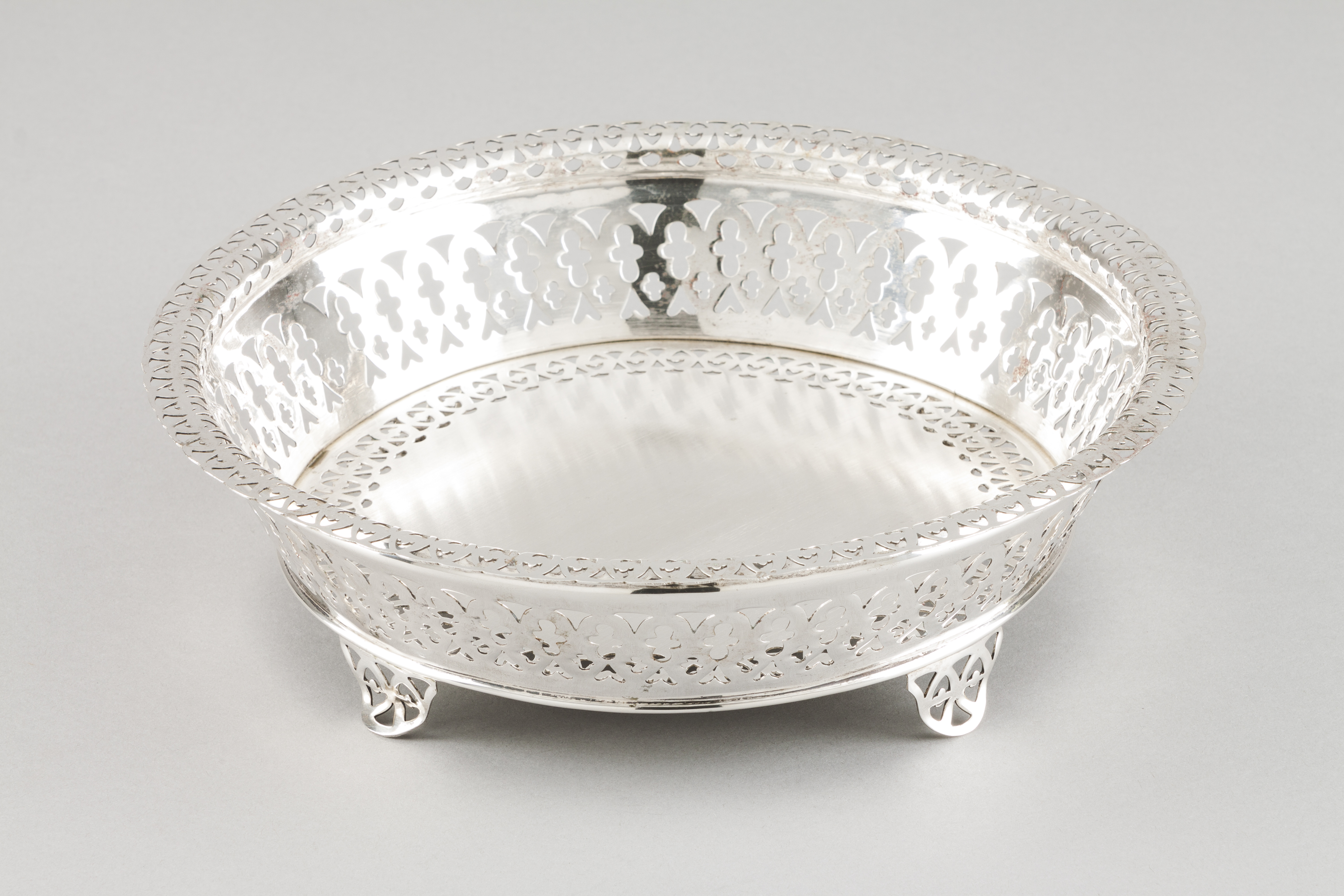 Fundo liso com faixa vazada, aba e topo inteiramente vazados com motivos idênticos assente em 3 pés