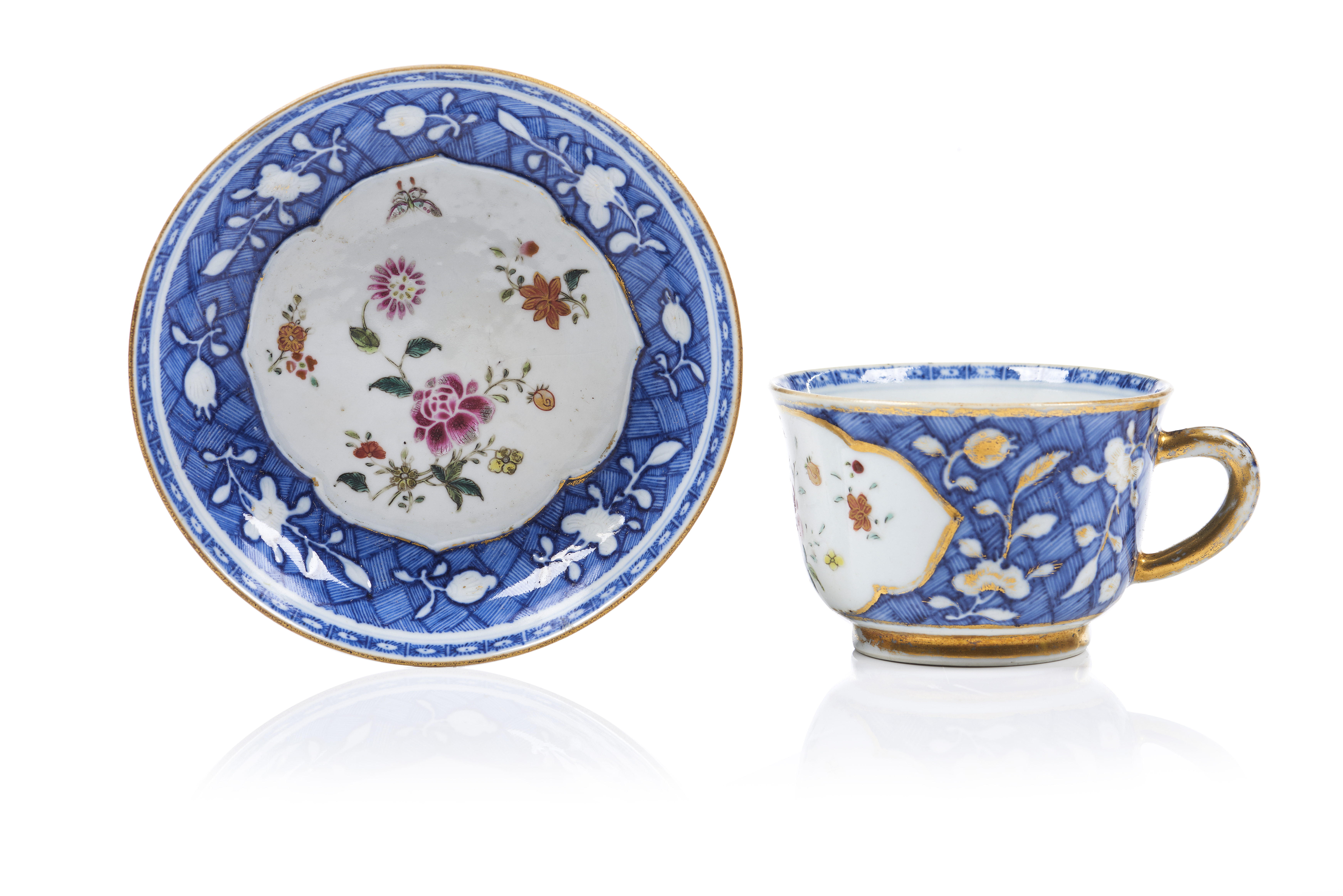 Decorada a azul sob vidrado e com esmaltes da Família Rosa representando motivos florais