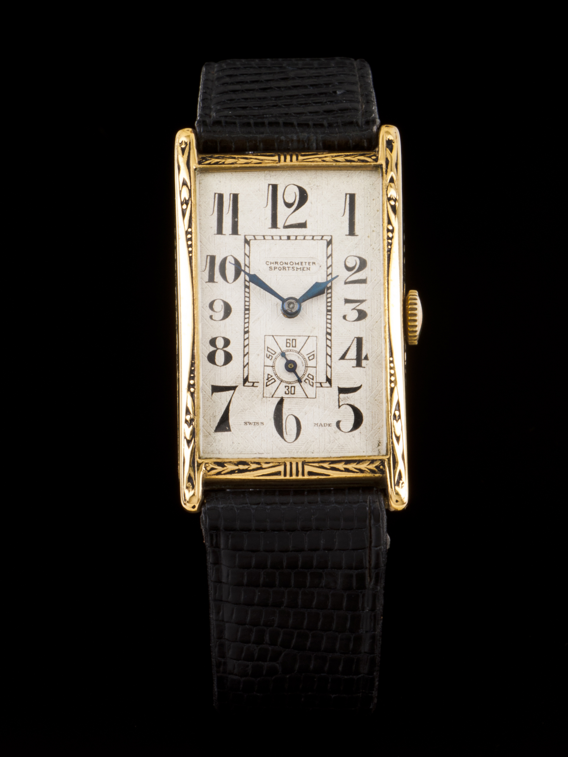 Relógio de pulso marca Chronometer Sportsmen com caixa trabalhada em plaquê com 25mm x 41mm. Movimento mecânico de corda manual. Mostrador com trabalhados. Peça em bom estado com pequenas marcas de uso. A funcionar ao momento da avaliação
