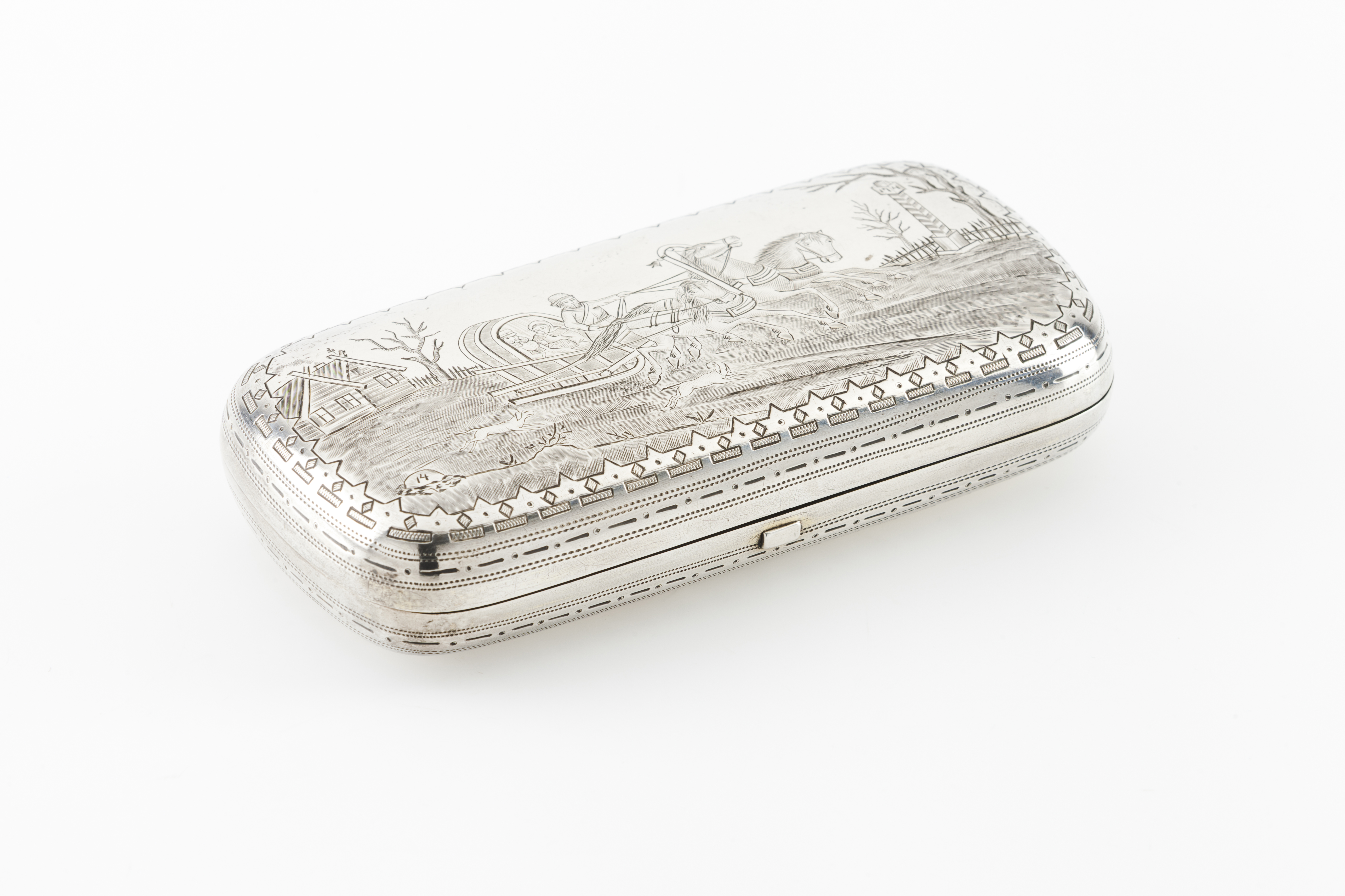 Gravada na tampa com cena campestre com grupo de pessoas transportado numa troika, puxada por 3 cavalos