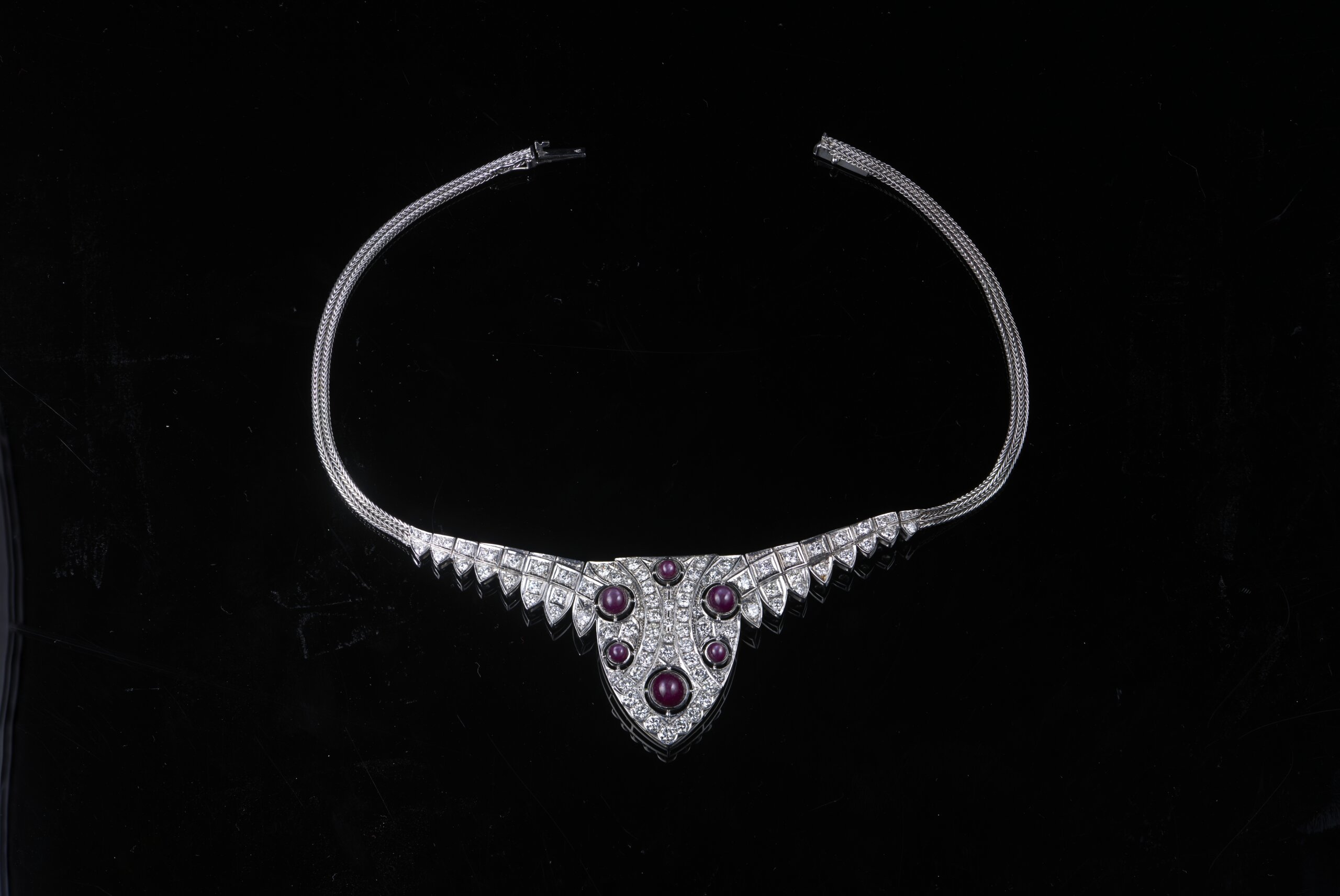 Cravejado com 6 rubis em talhe cabochon e 85 diamantes em talhe de brilhante com o peso total aproximado de 6 ct.
