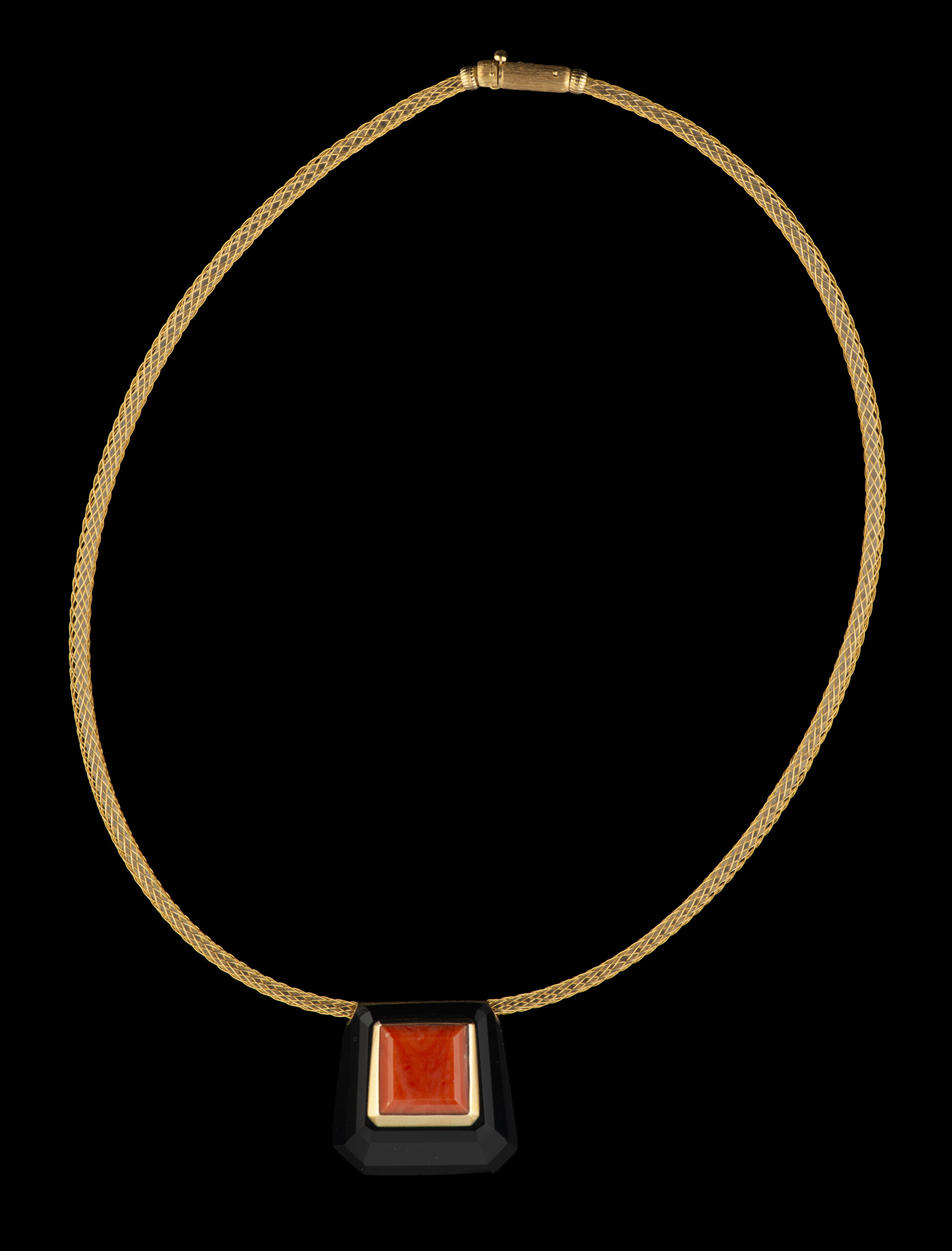 Pendente trapezoidal cravejado com ónix e coral